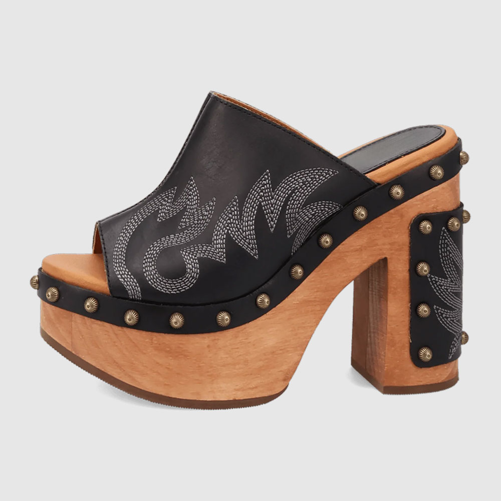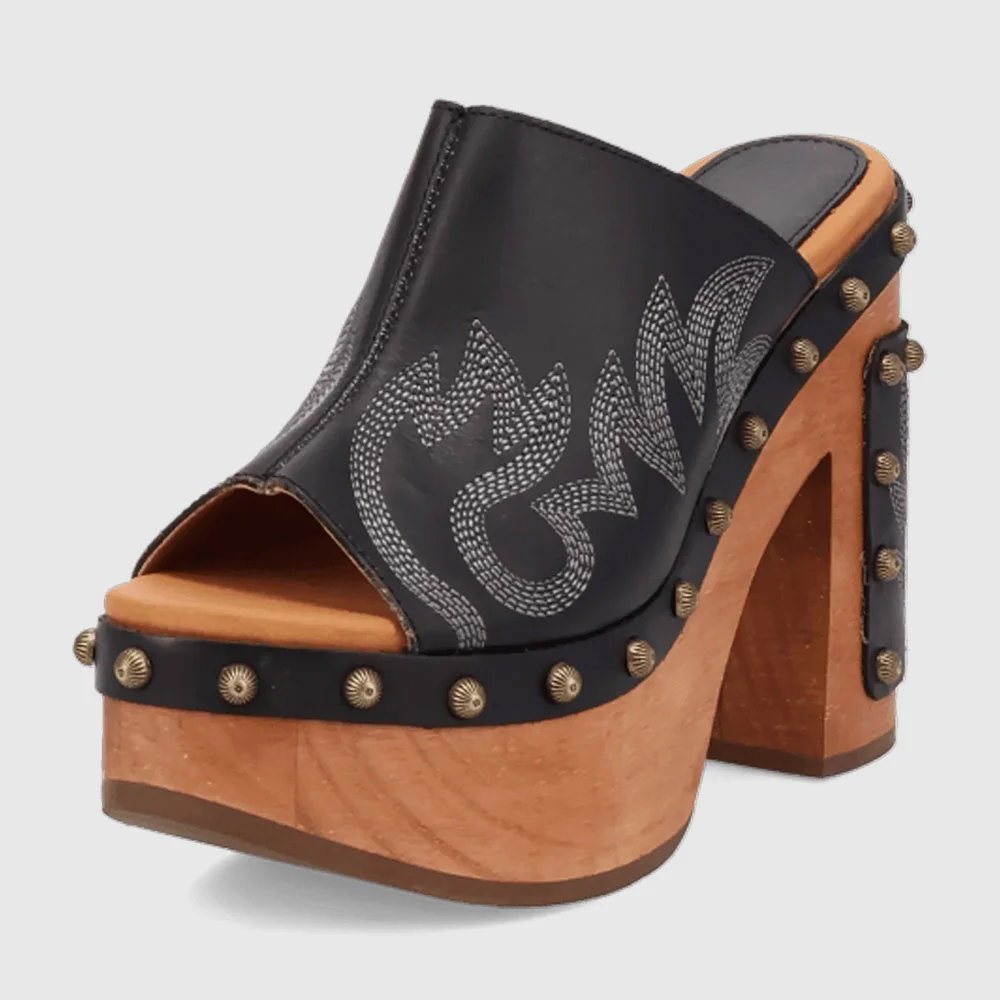 • Special Designs: The peep-toe chunky heeled mules feature a platform and a studded design, with embroidered detail.
