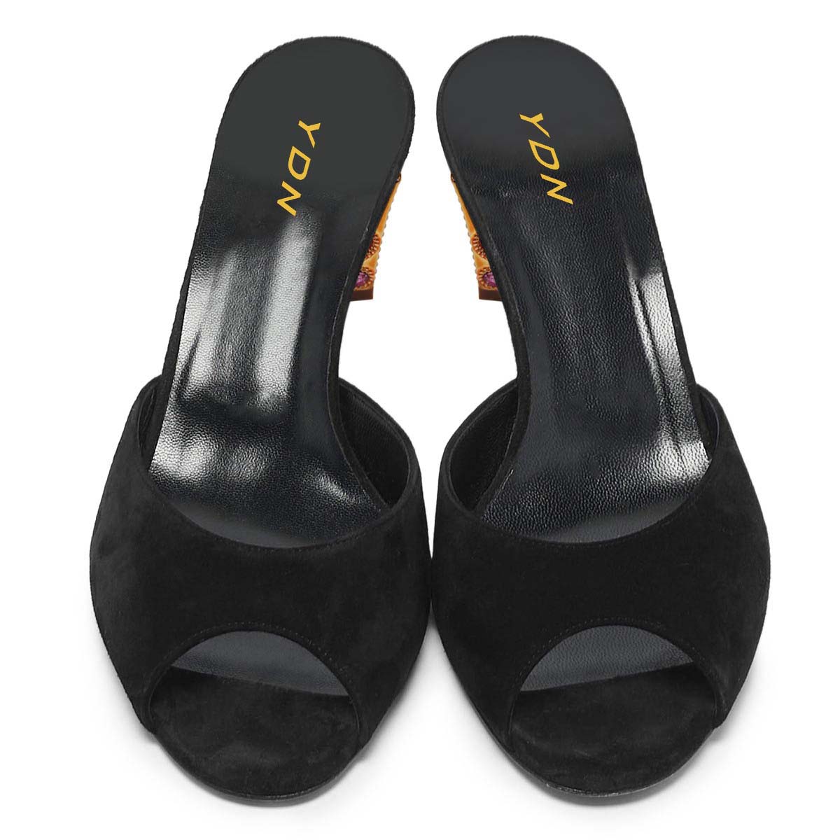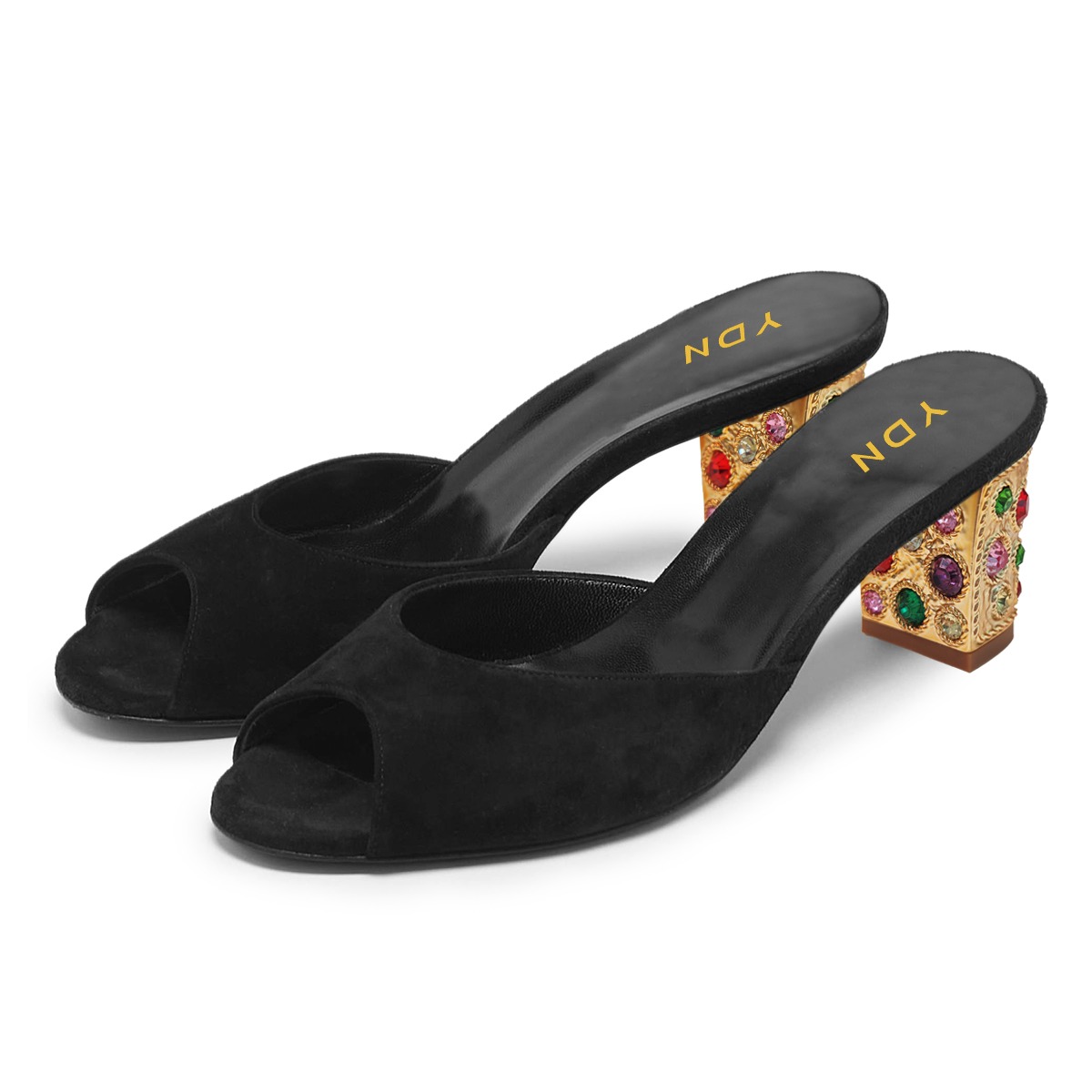 • Special Designs: The peep-toe mule shoes feature rhinestone embellished sculptural heels and a slip-on design.