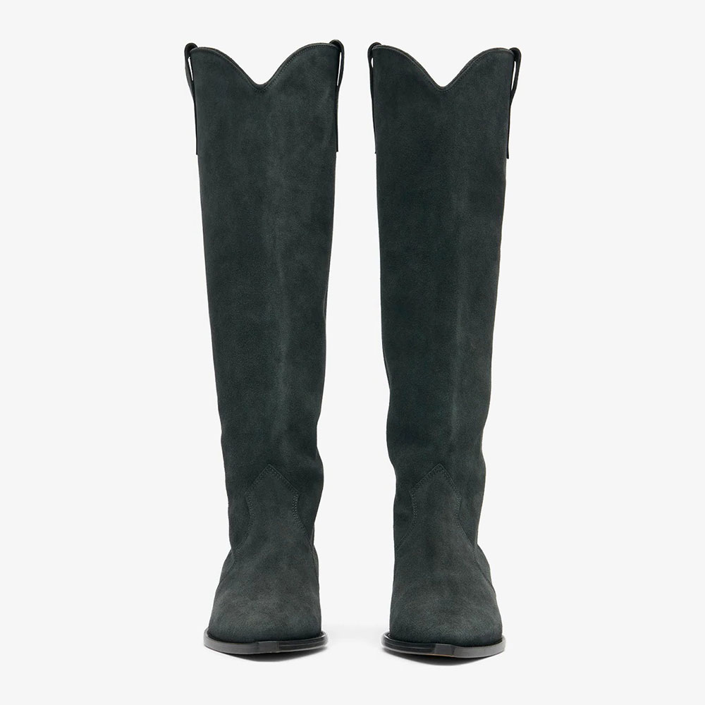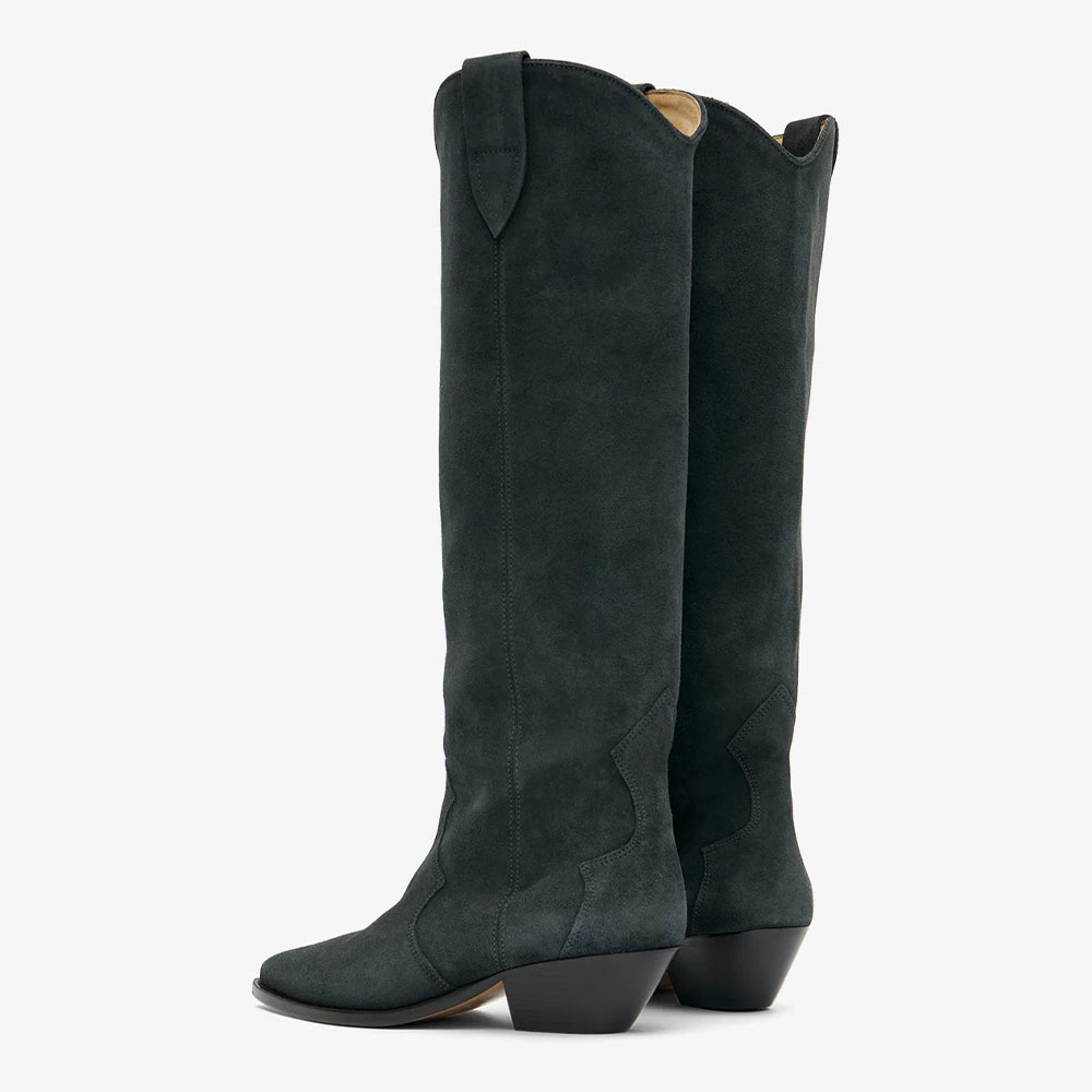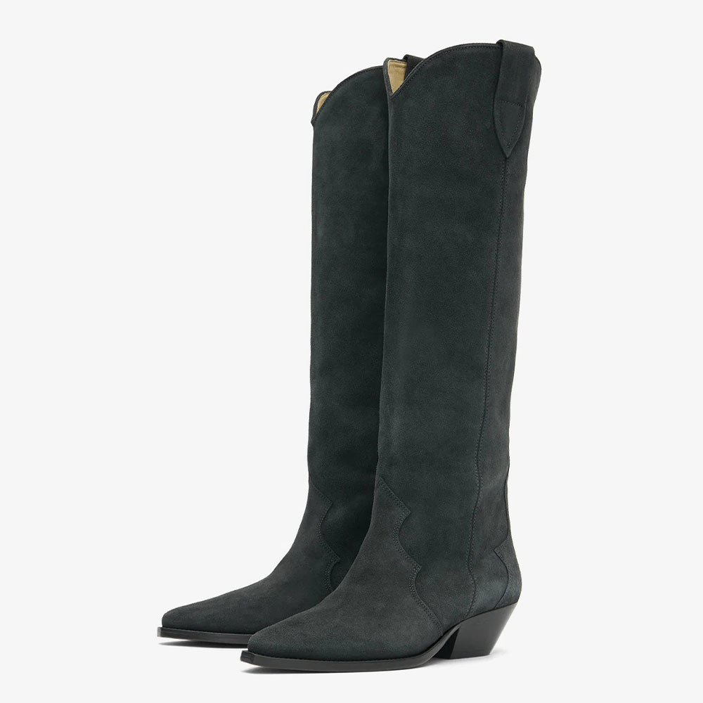Black Pointed Toe Block Low Heel Long Cowgirl Boots for Women