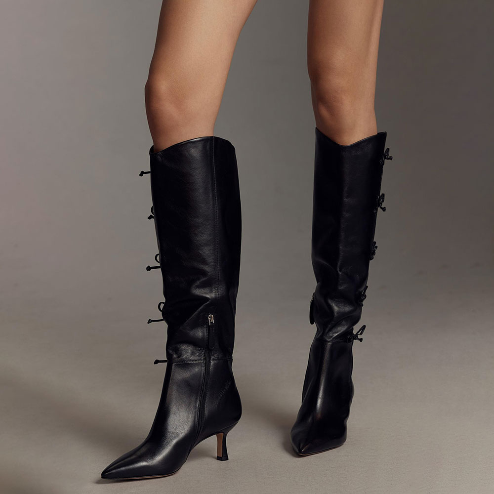 Special Designs: The pointed-toe knee-high boots feature spool heels, a half-zipper design, and bow decor on the shaft.