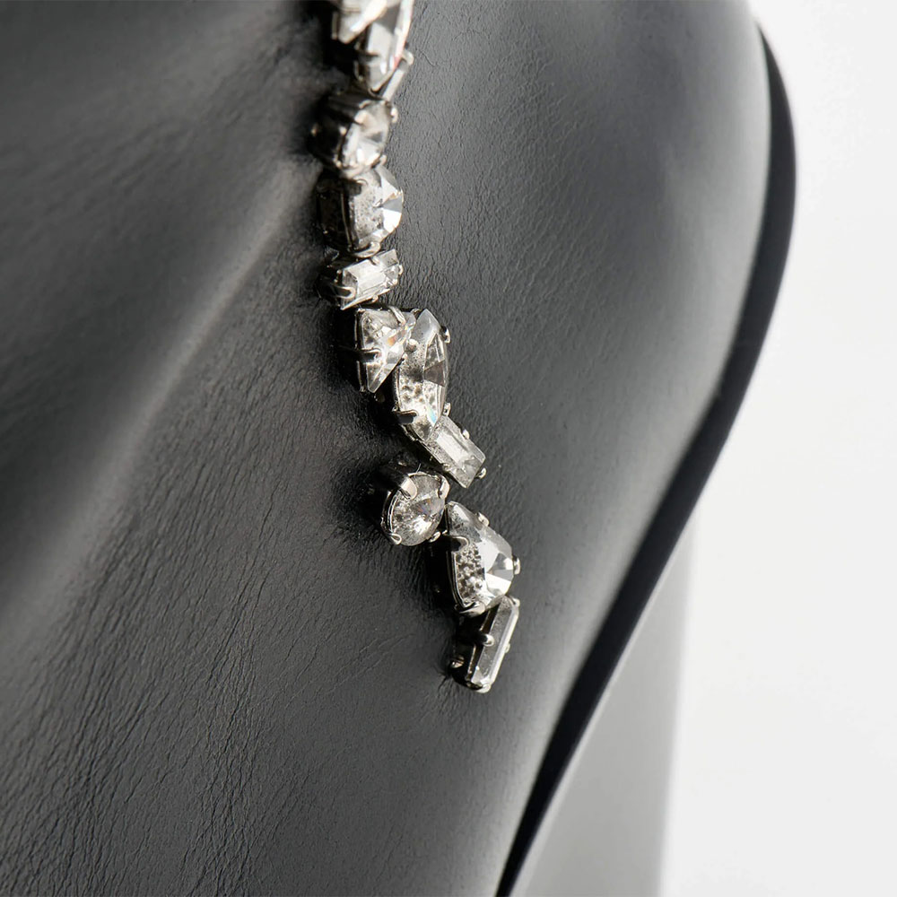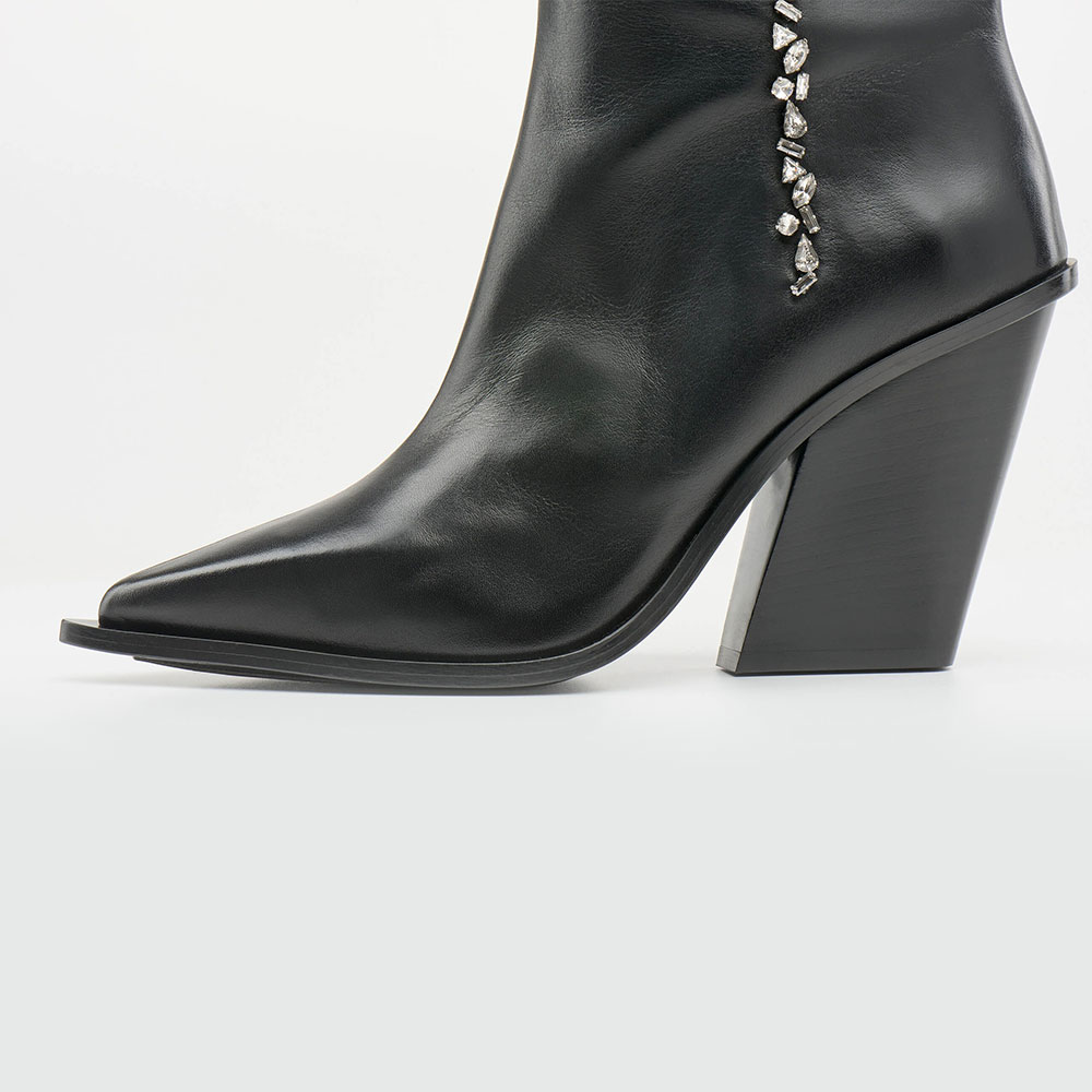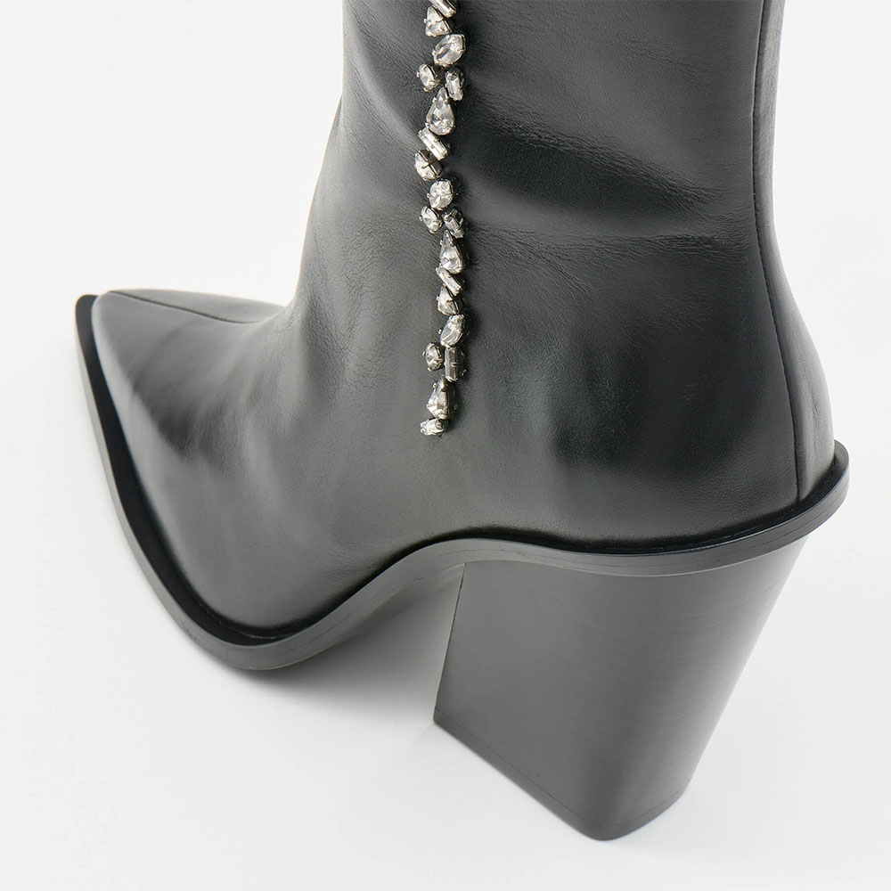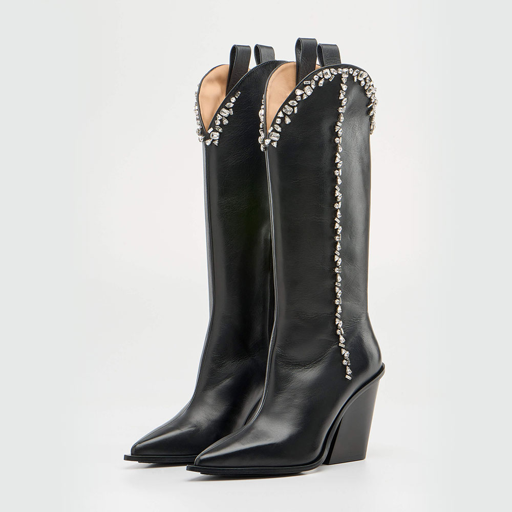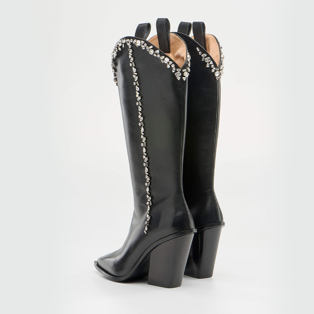 Special Designs: The black knee-high cowgirl boots feature a pointed toe and chunky heel, embellished with sparkling rhinestone accents.
