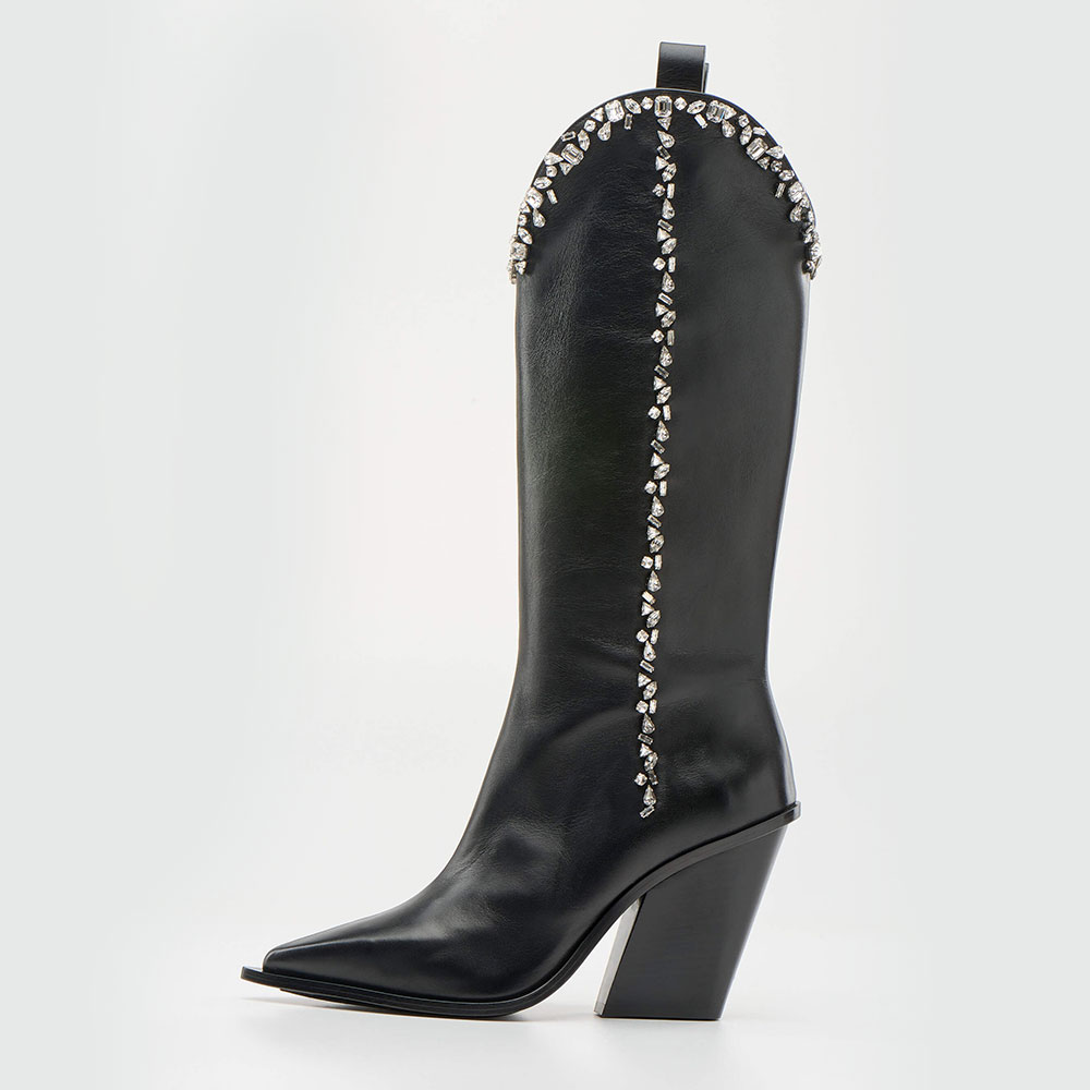 Black Pointed Toe Chunky Heel Knee High Cowgirl Boots with Rhinestone