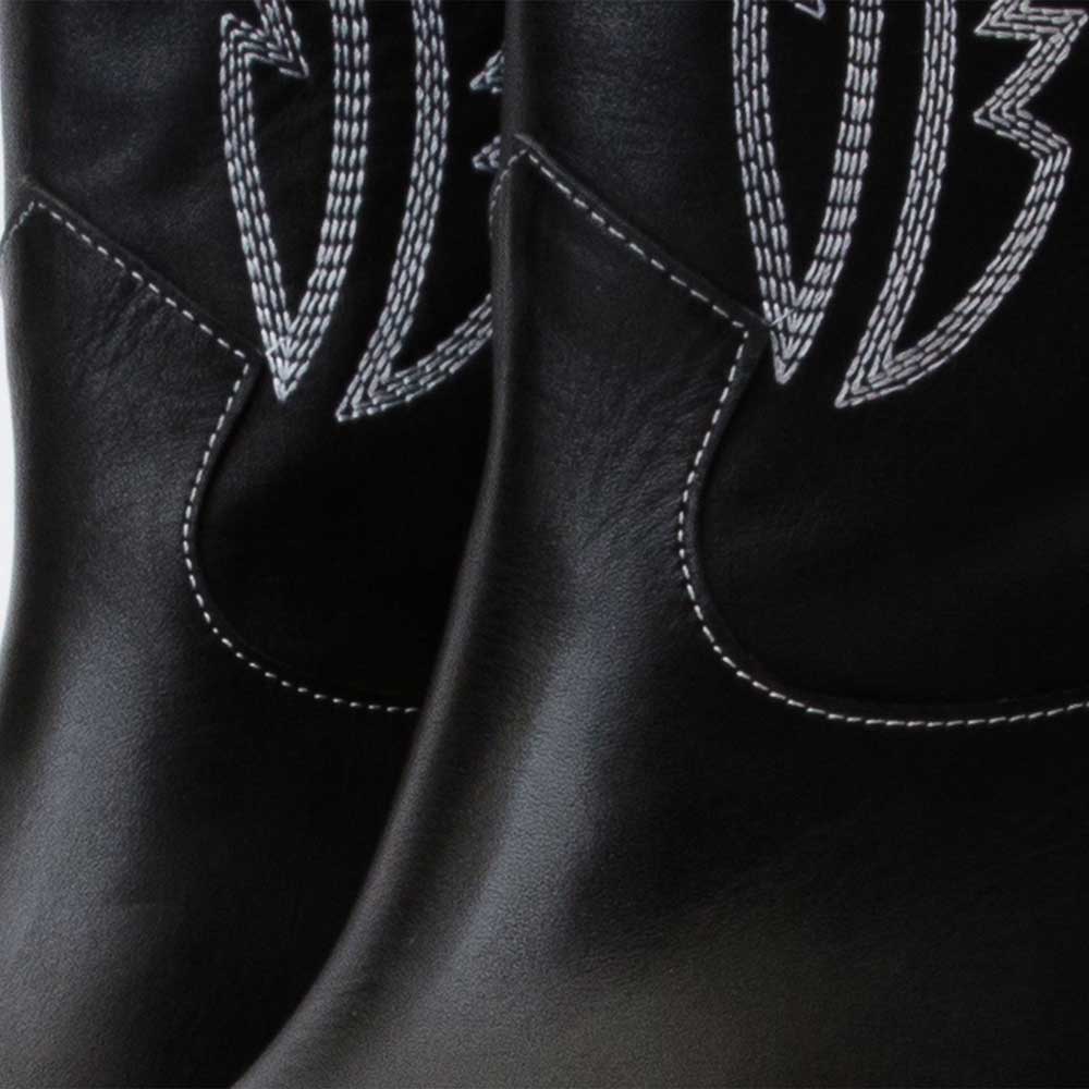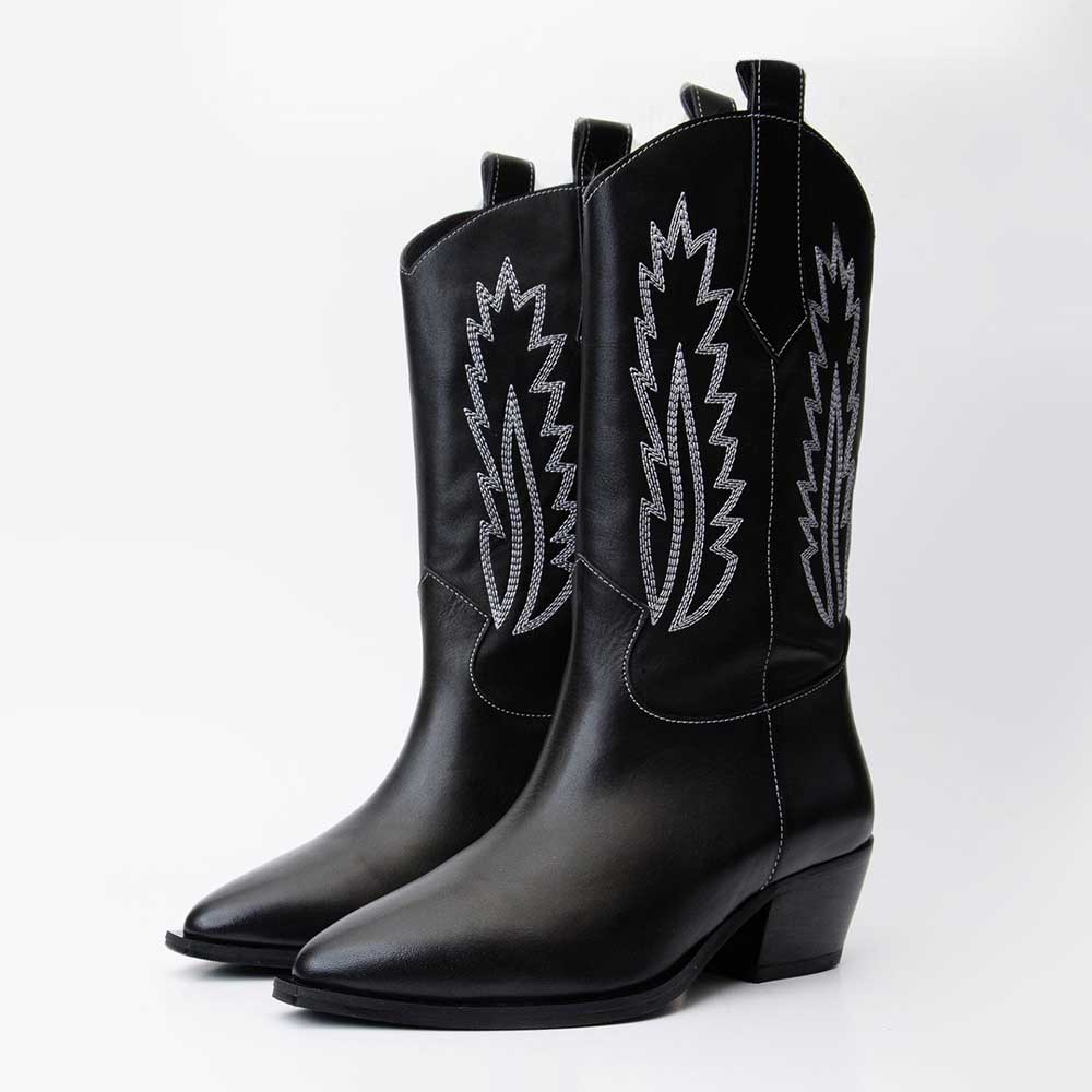 Special Designs: The vegan leather pointed-toe western boots feature white embroidered decoration along the sides and a comfortable chunky heel.