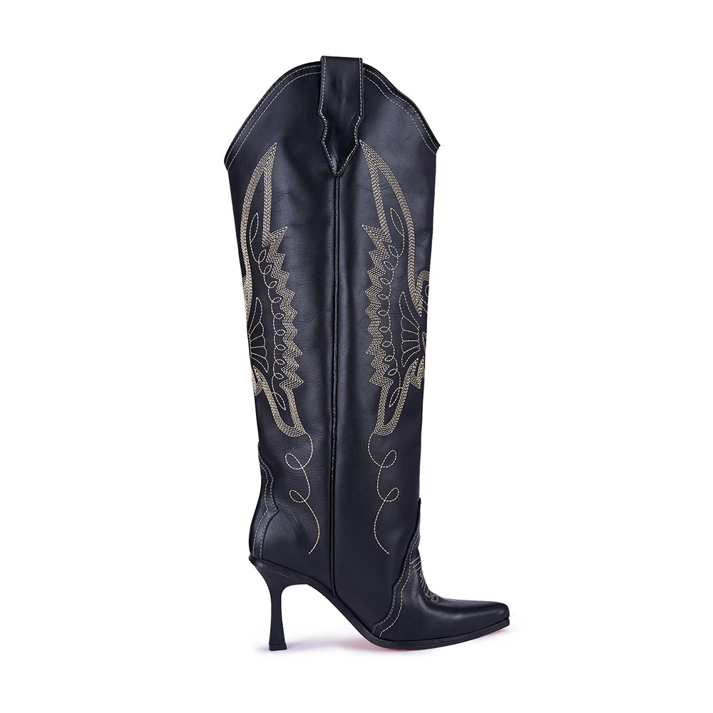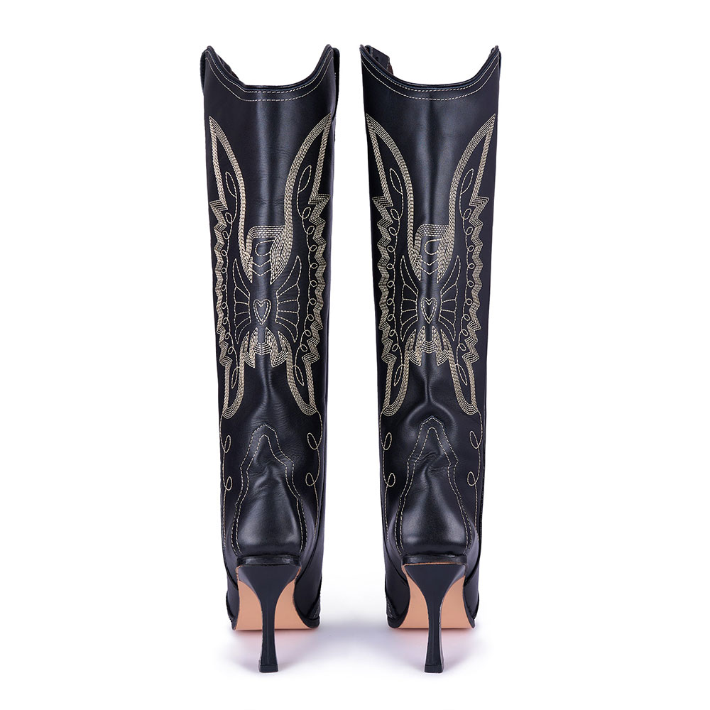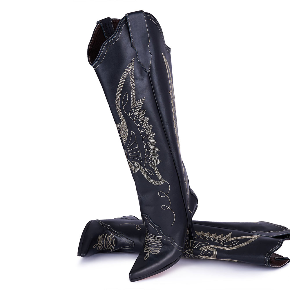 Black Pointed Toe Embroidered Flared Heel Knee-High Cowgirl Boots