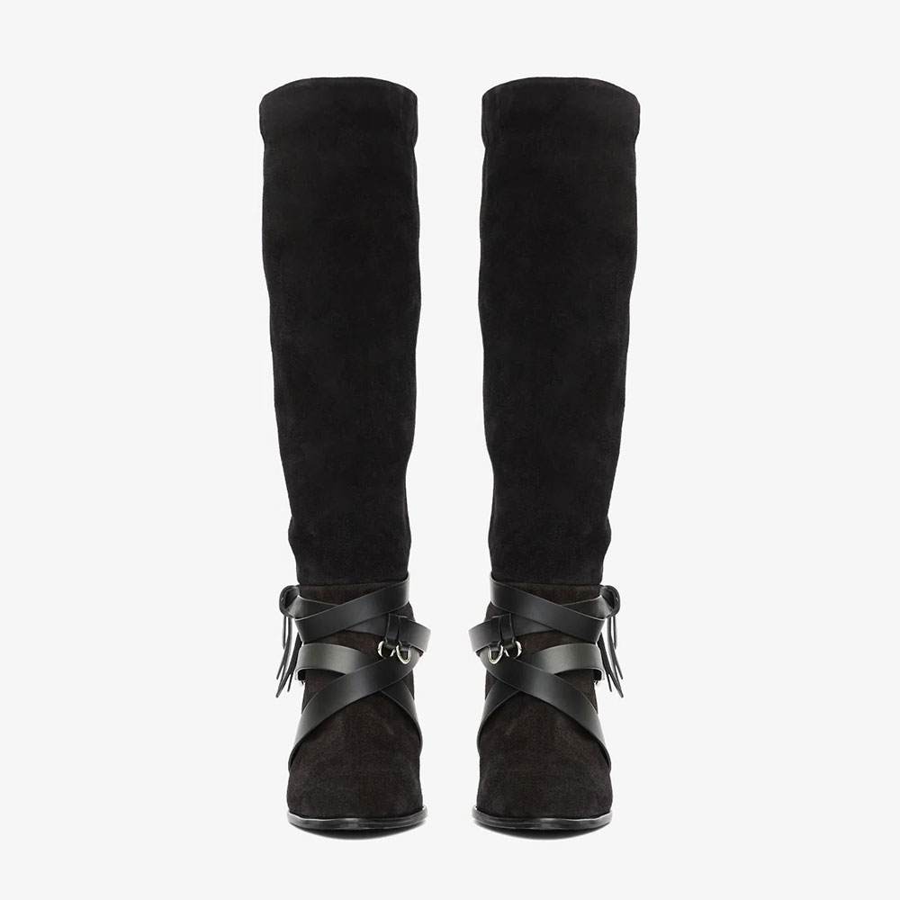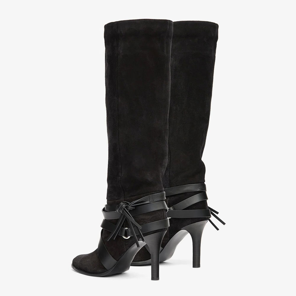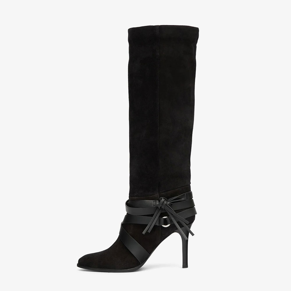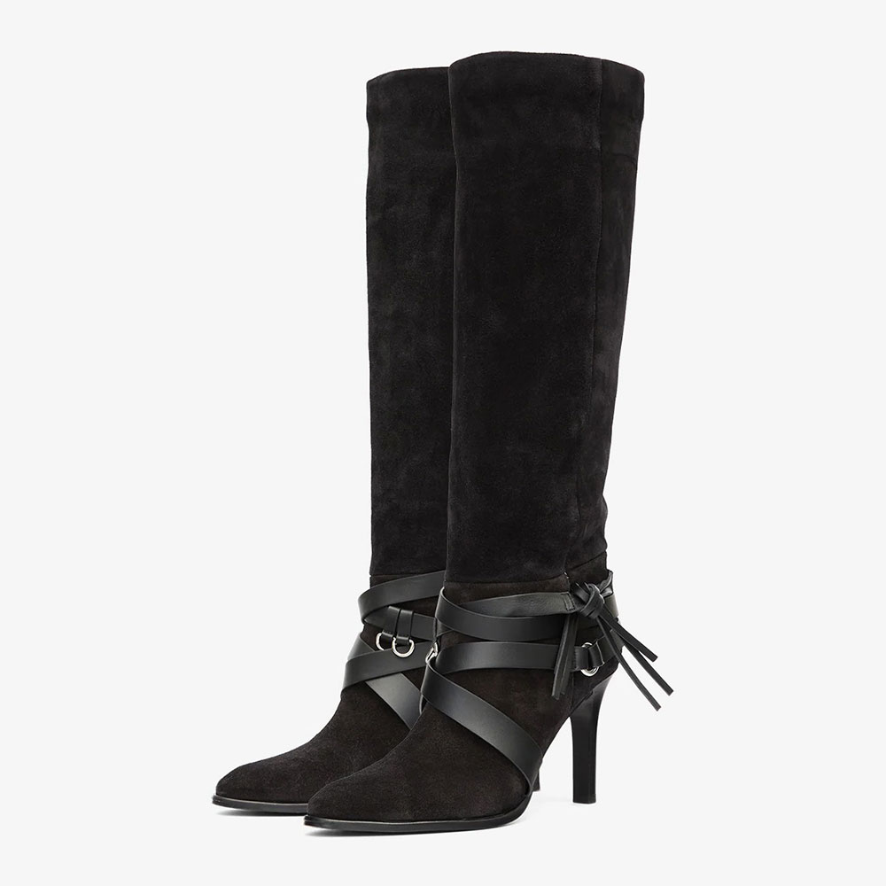 Special Designs: The black knee-high boots are made of vegan suede and feature slender stiletto heels, multiple crisscrossing faux leather straps at the ankles, adorned with rings.