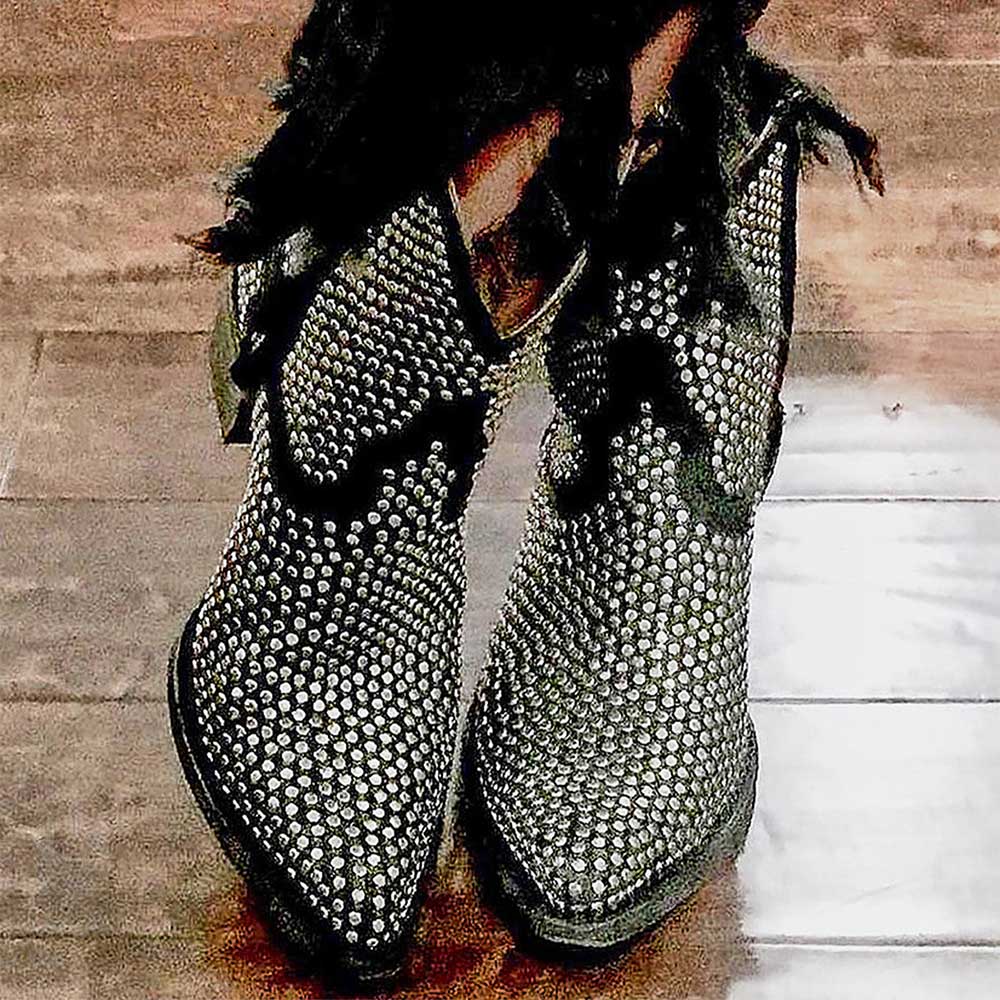 • Special Designs: The black cowgirl boots feature a pointed toe and chunky heel, with side zipper and studs.