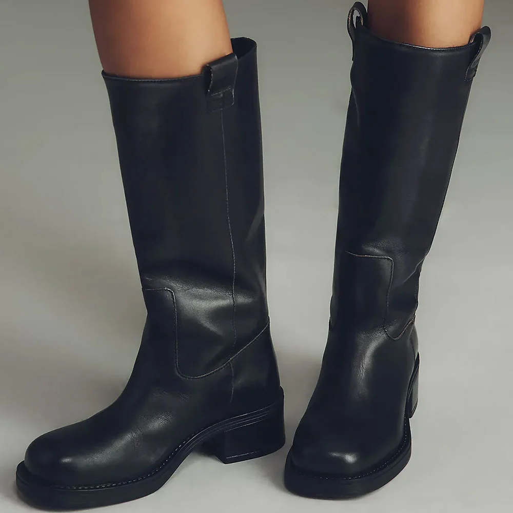 Black Round Toe Chunky Heel Pull On Mid Calf Boots for Women