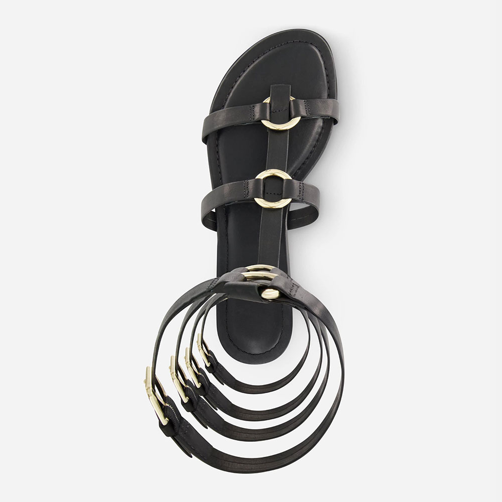 Special Designs: The gladiator sandals feature a flat heel, a strappy design, gold rings, and adjustable buckles.