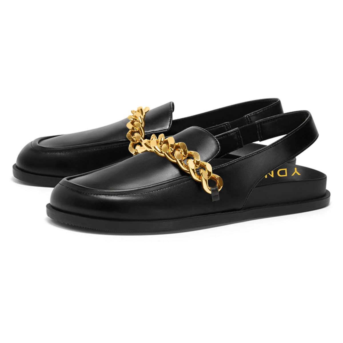 Black Round Toe Flat Slingback Women's Loafers with Gold Metal Chain