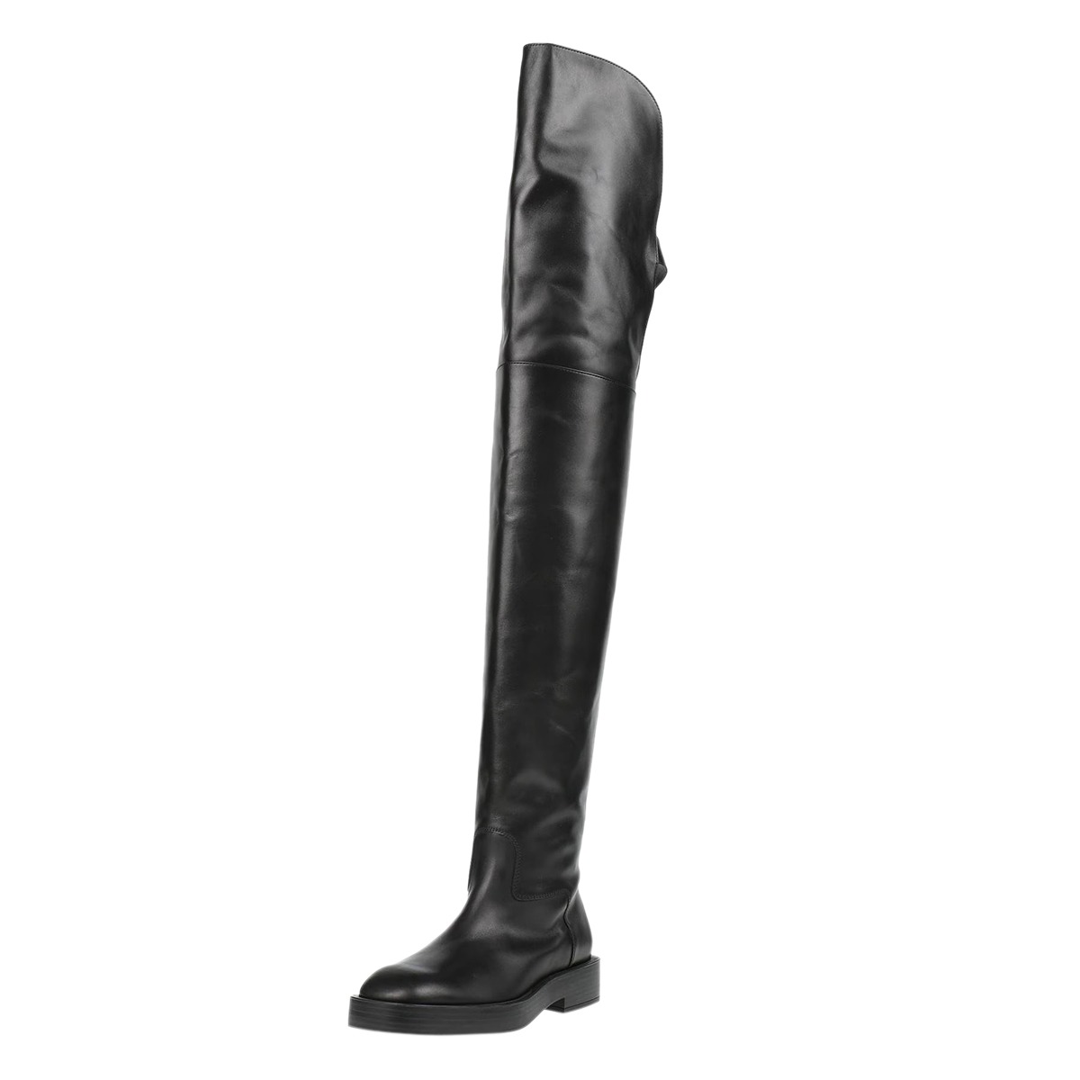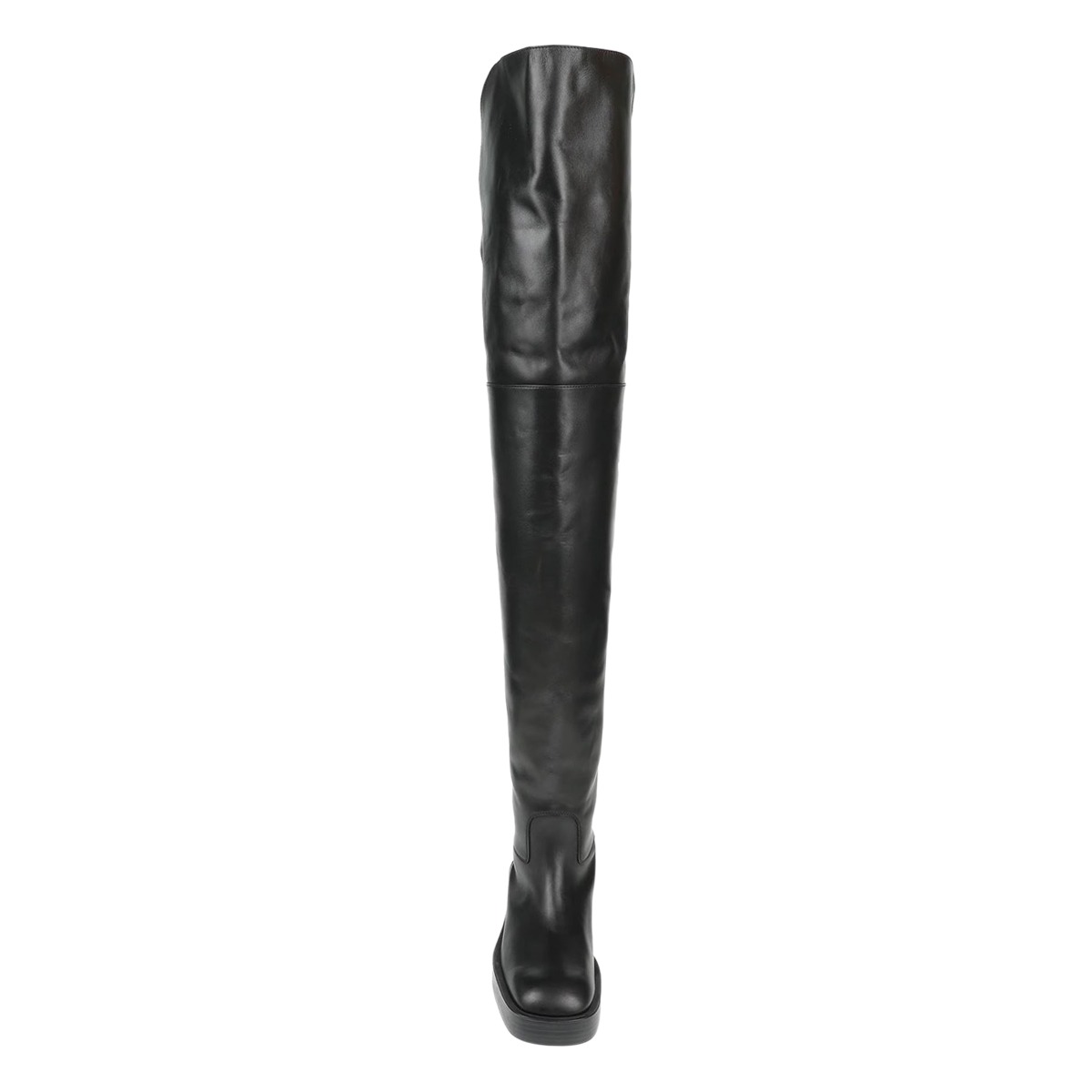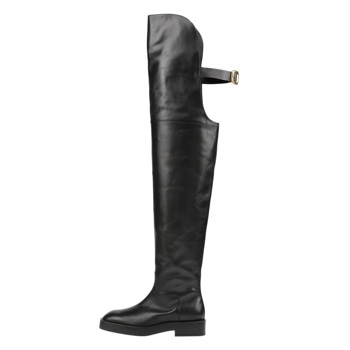 Special Designs: The black thigh-high boots feature an adjustable buckle strap, a cut-out design, and a low chunky heel.