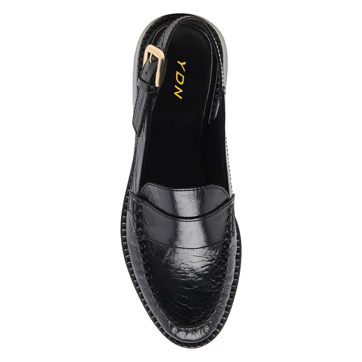 Special Designs: Black loafers featuring an adjustable buckle fastening slingback pattern and slip-on convinience.