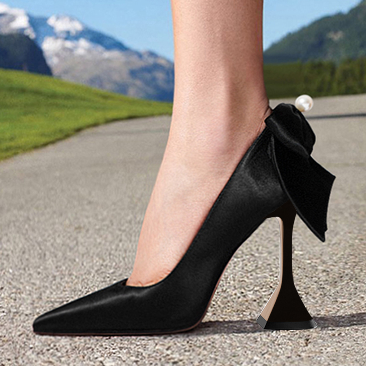 Black Satin Pointed Toe Back Bow Inlay Elegant Pumps with Flared Heel