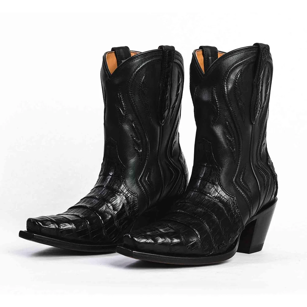 Black Snip Toe Chunky Heel Croc Embossed Cowboy Boots for Women