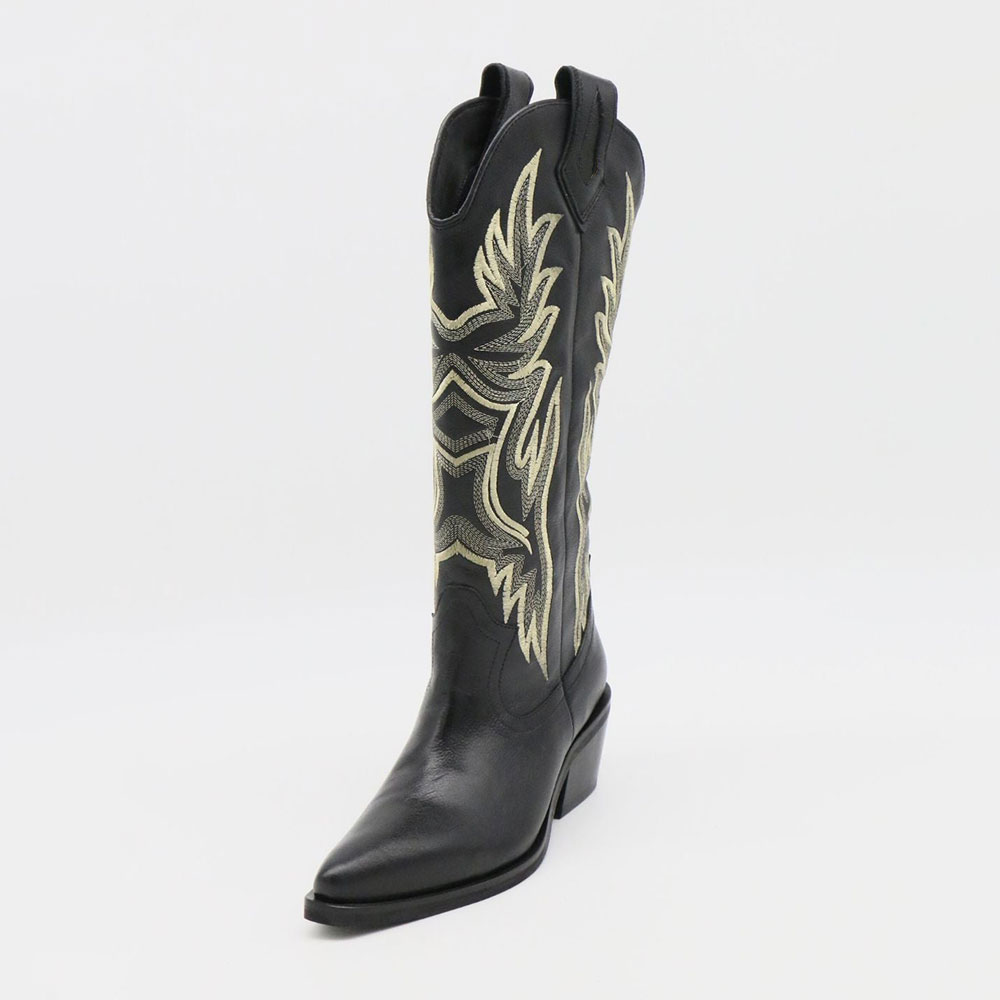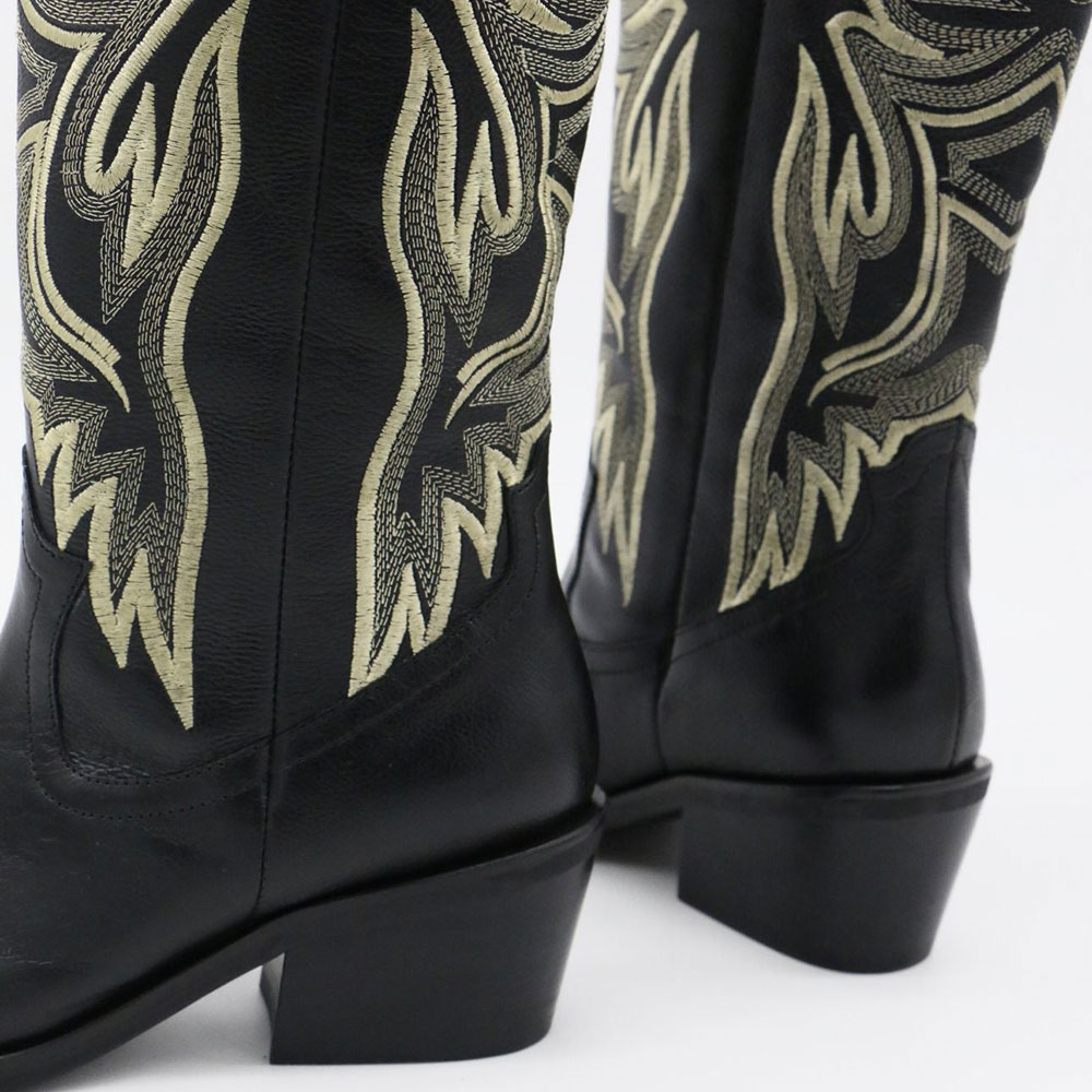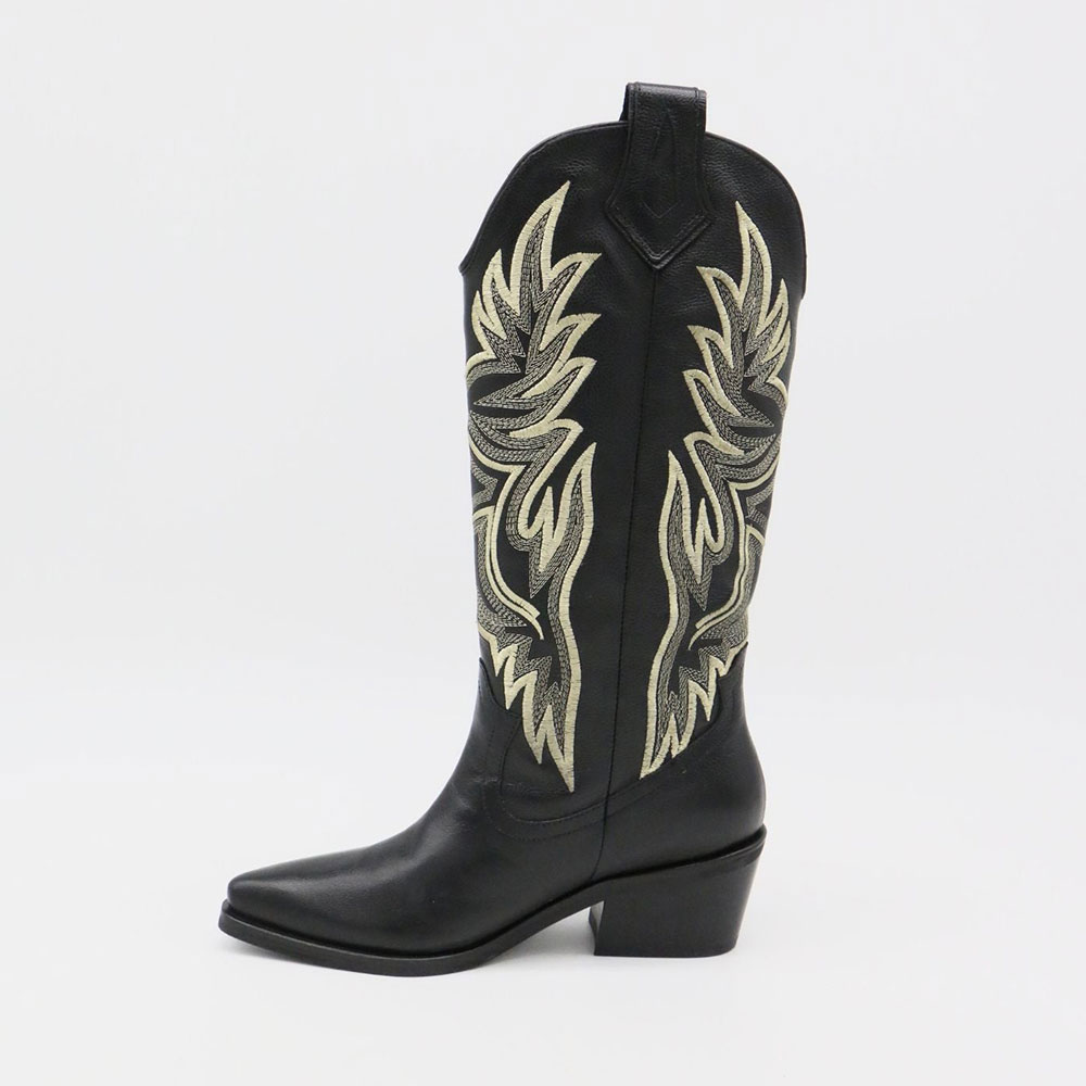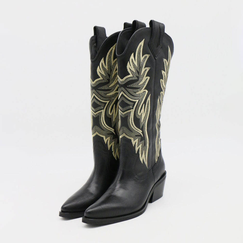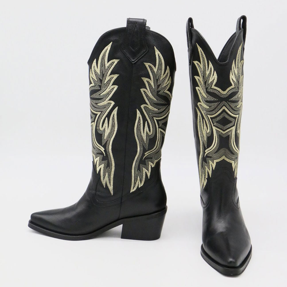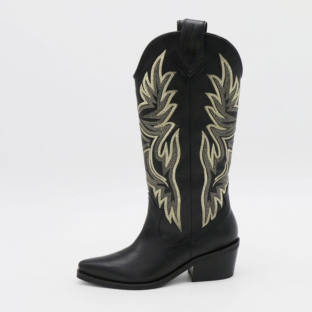 Special Designs: The black mid-calf cowgirl boots feature beautiful embroidery and a comfortable chunky heel.