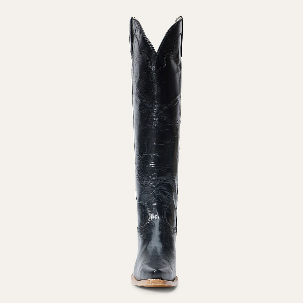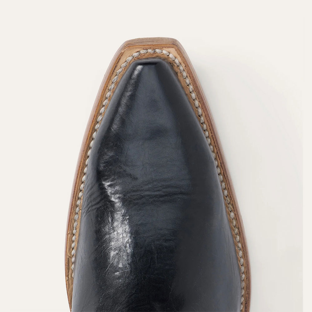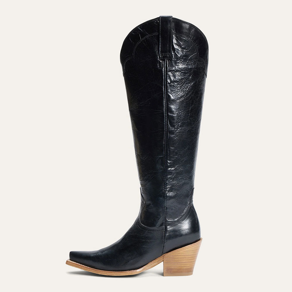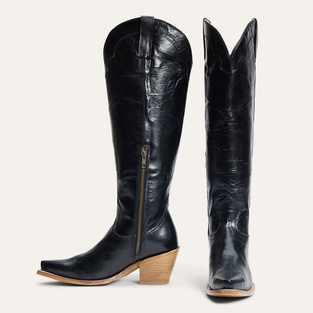 • Special Designs: The black cowgirl boots feature a snip toe and chunky heel, with a side zipper closure.