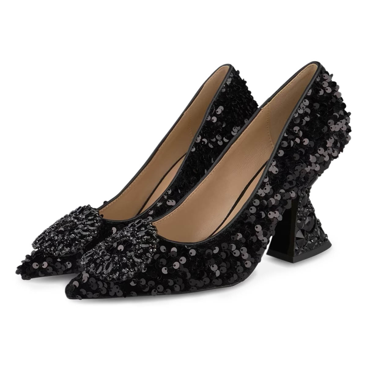 Black Sparkling Sequined Pointed Toe Rhinestone Embellished Pumps