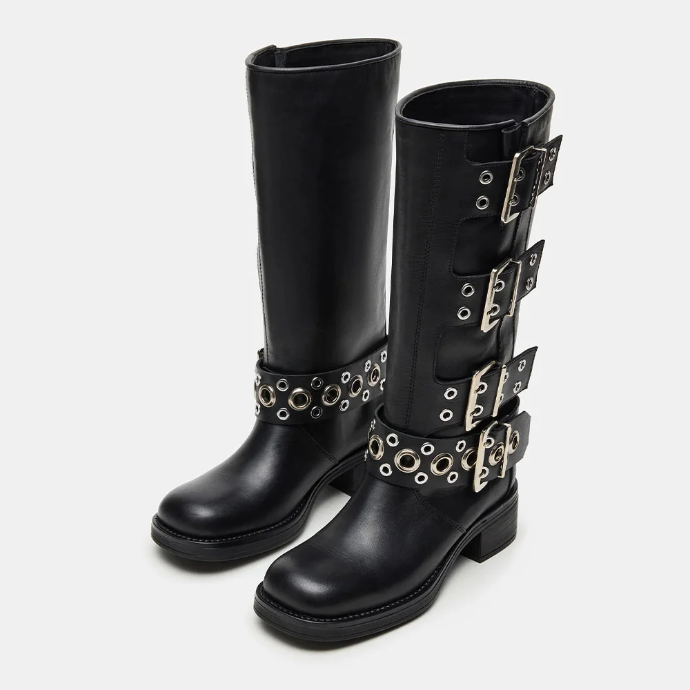 Black Square Toe Chunky Heel Buckle Grommet Knee High Boots for Women