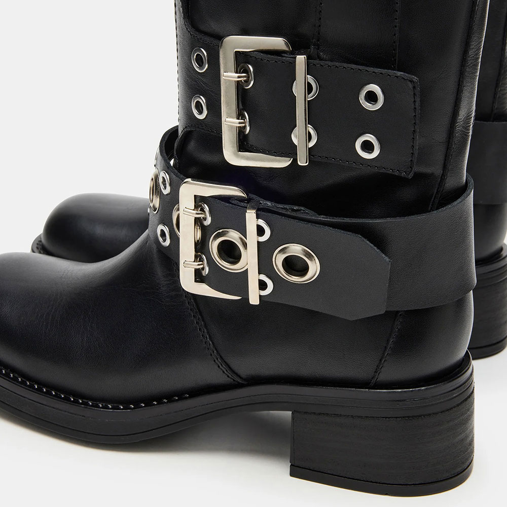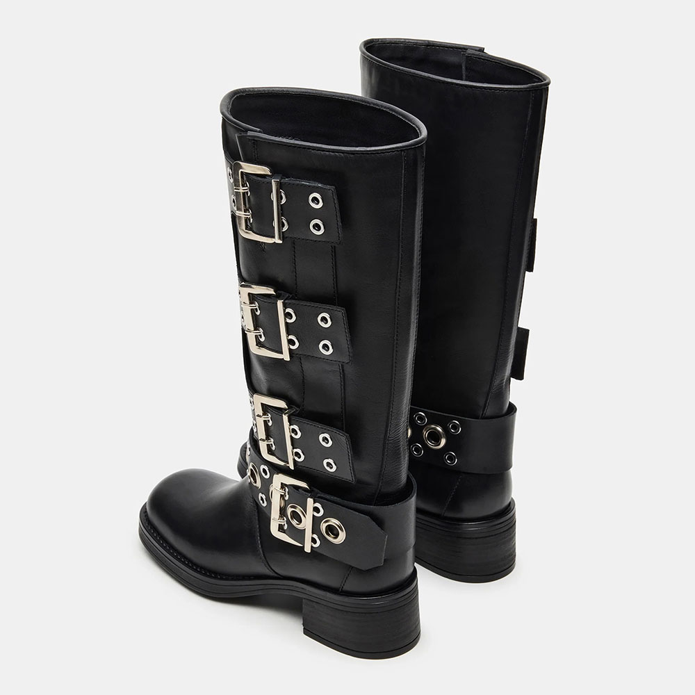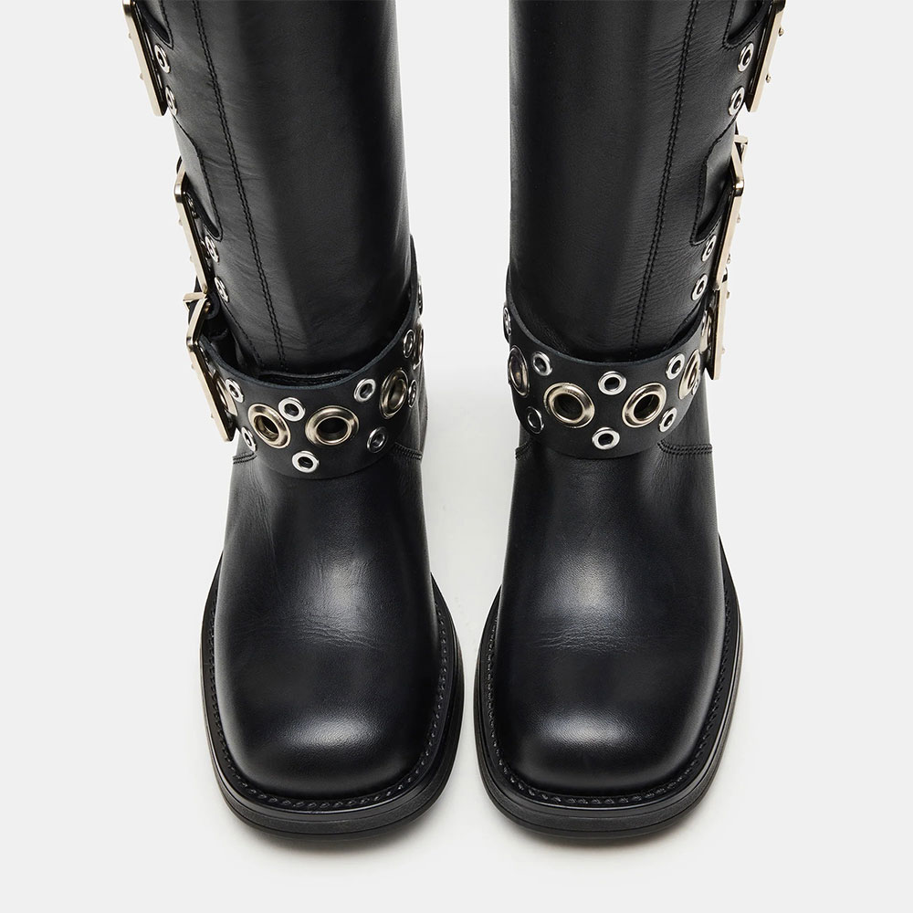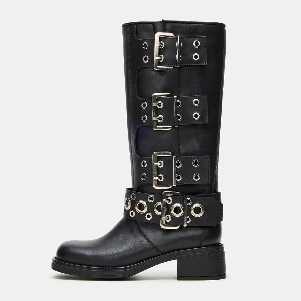 • Special Designs:The black knee-high boots feature a square toe and chunky heel, accented with grommets and multiple buckles.