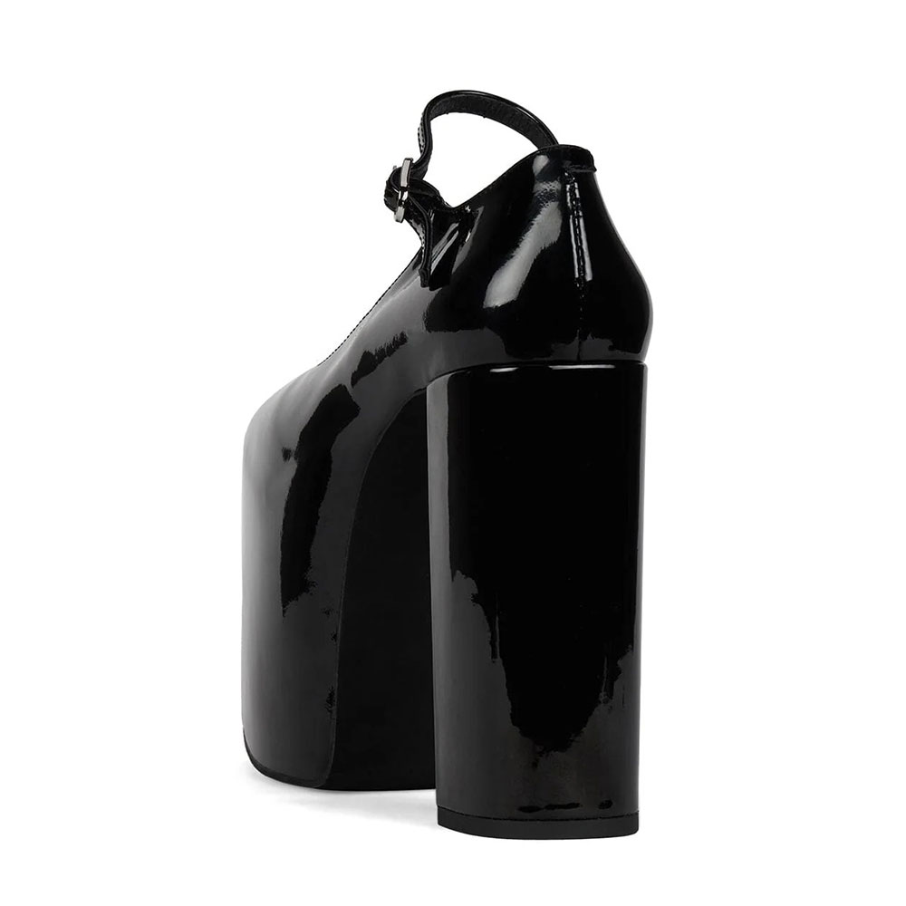 Special Designs: The black Mary Jane shoes feature straps with buckles, a high chunky heel, and a bold platform.