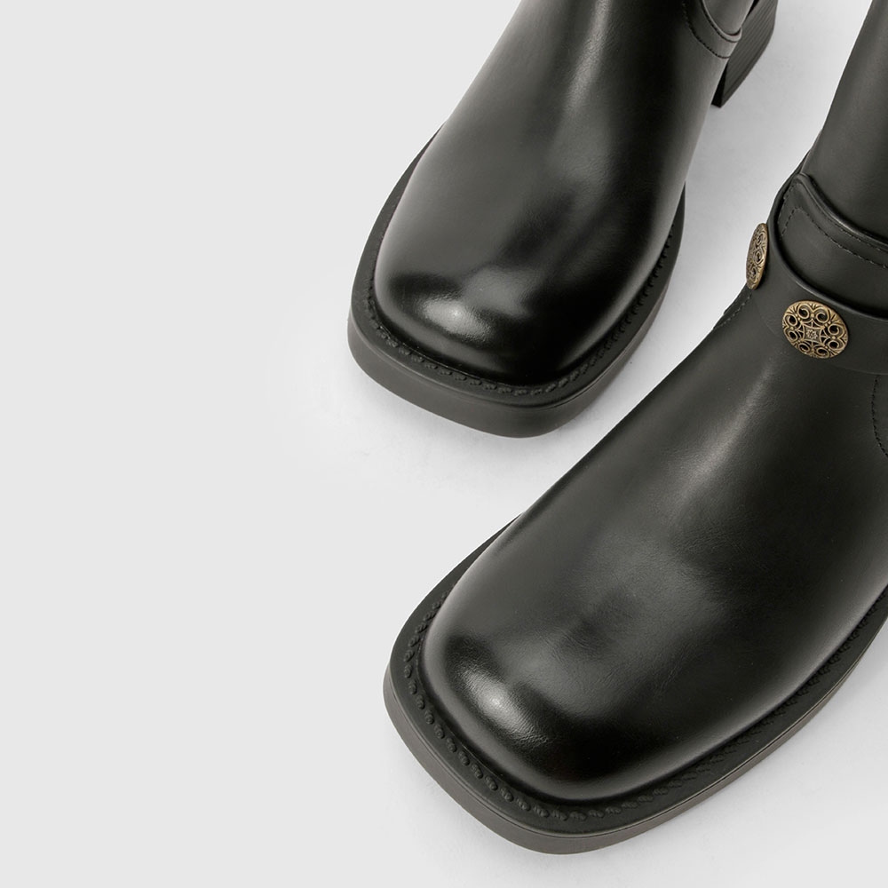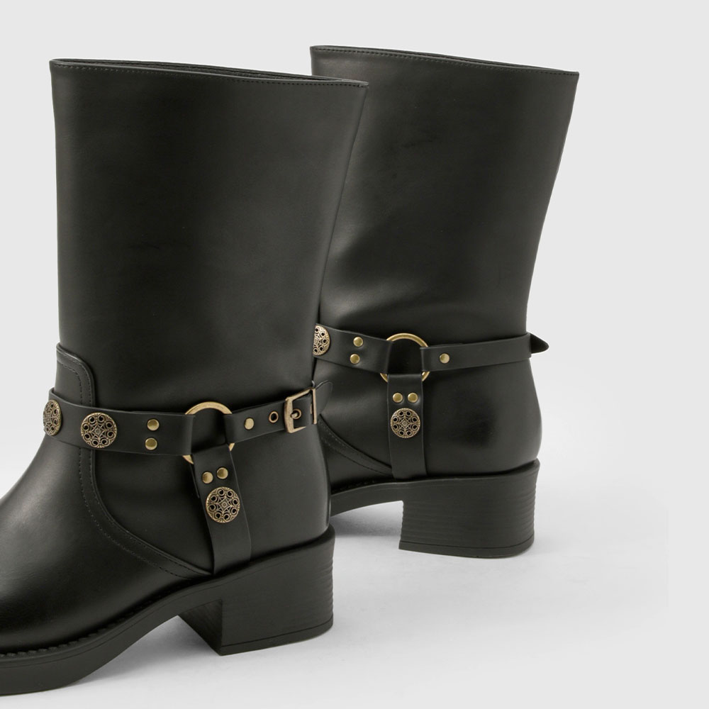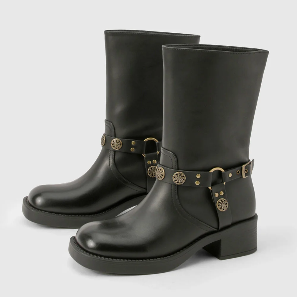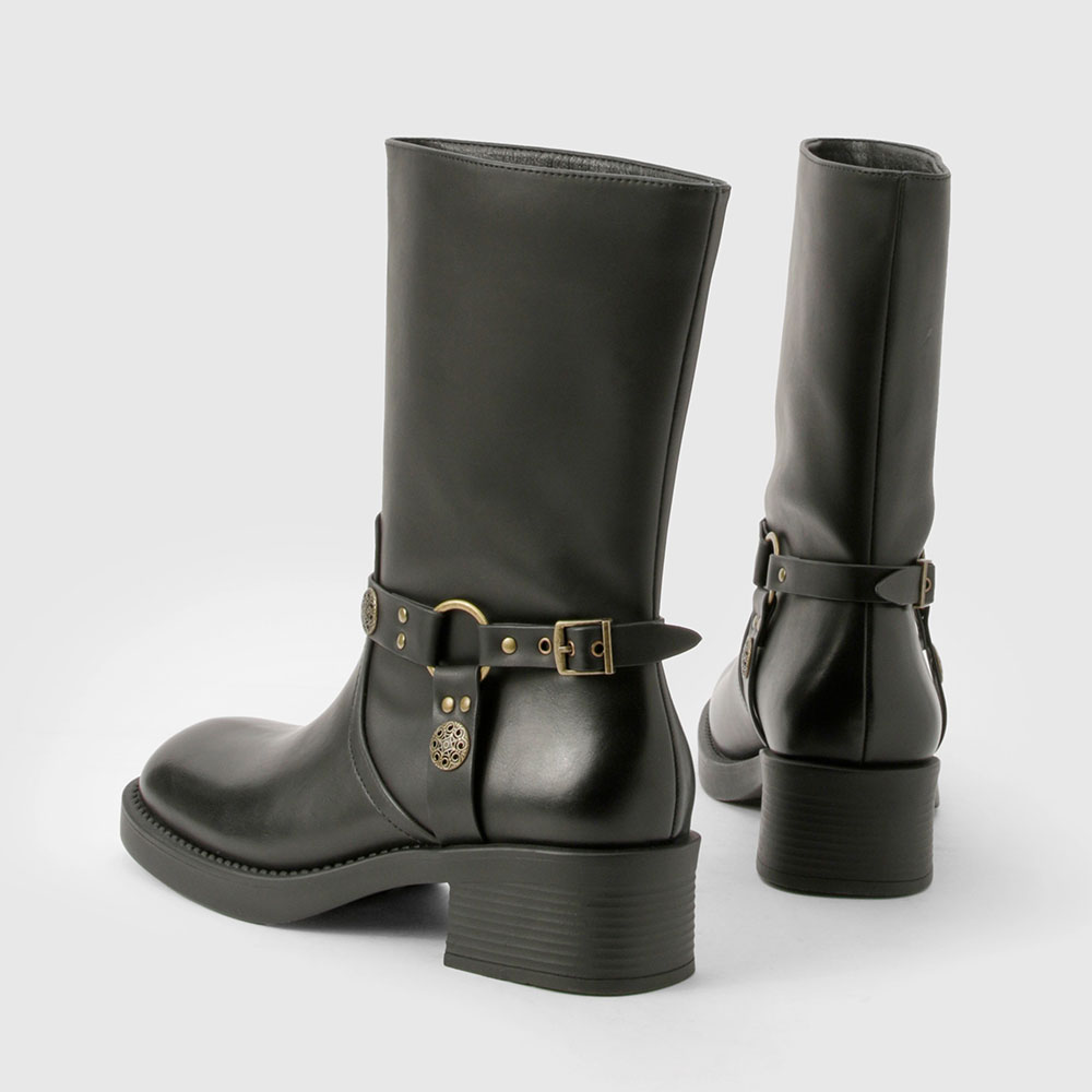 • Special Designs: The mid calf boots feature a gold stud, a gold ring, a button, an adjustable buckle, and a slip-on design.