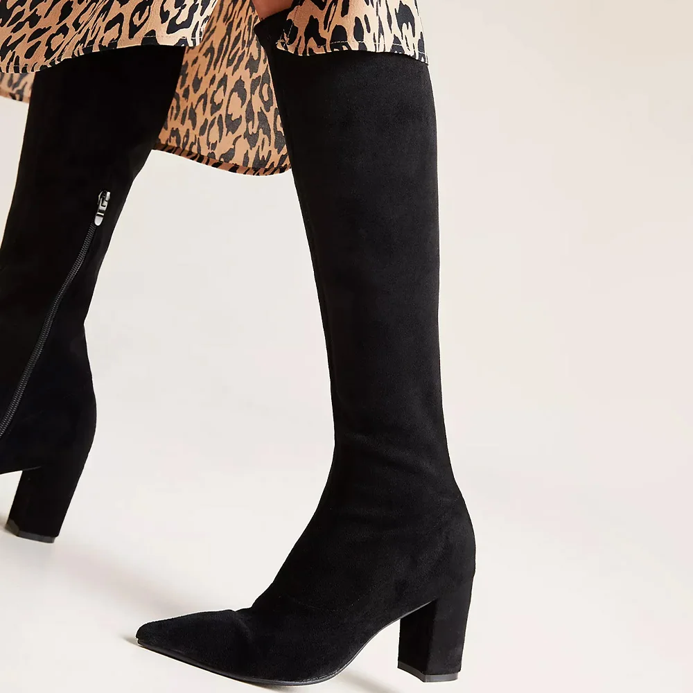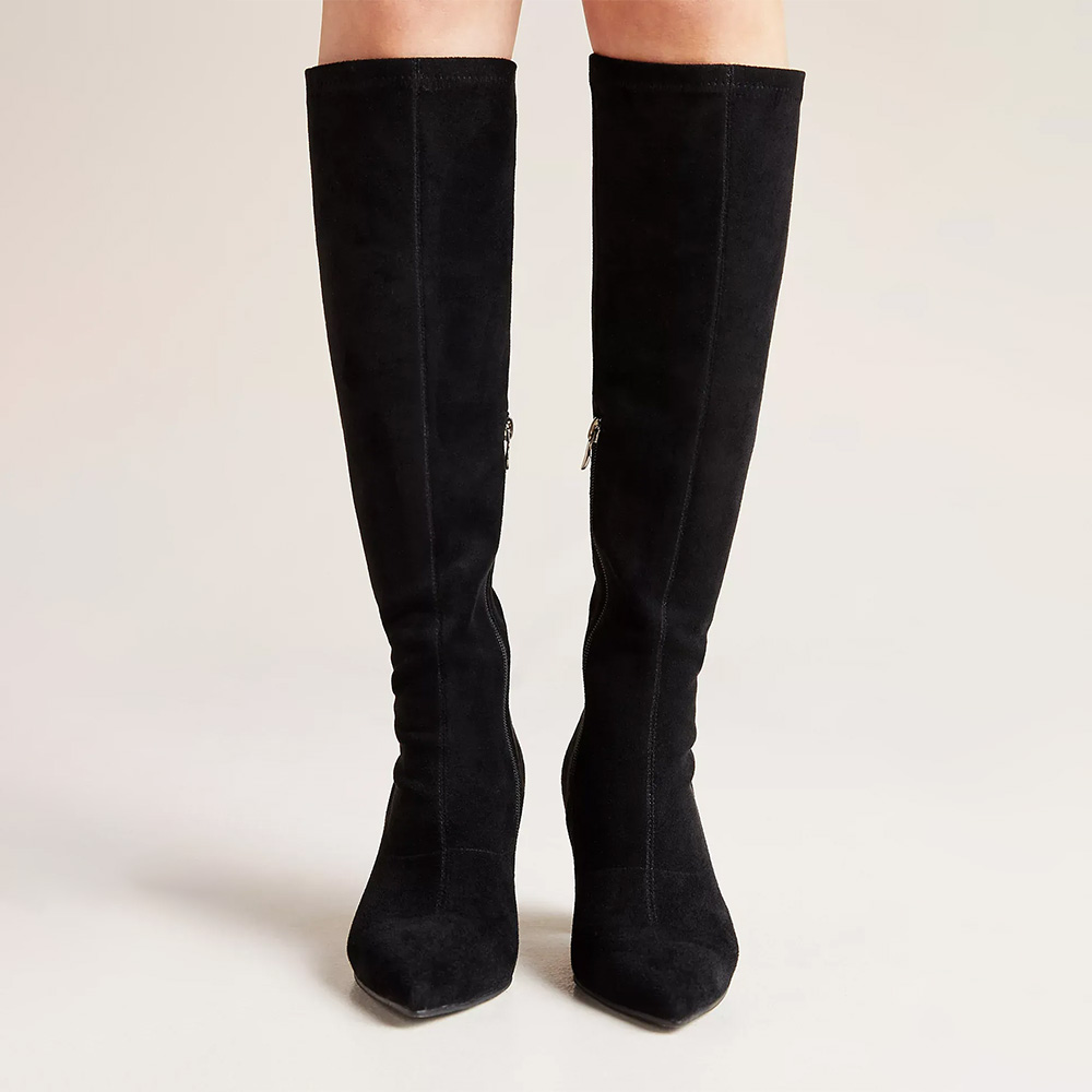 Black Stretch Vegan Suede Pointed Toe Zipper Knee High Boots for Women