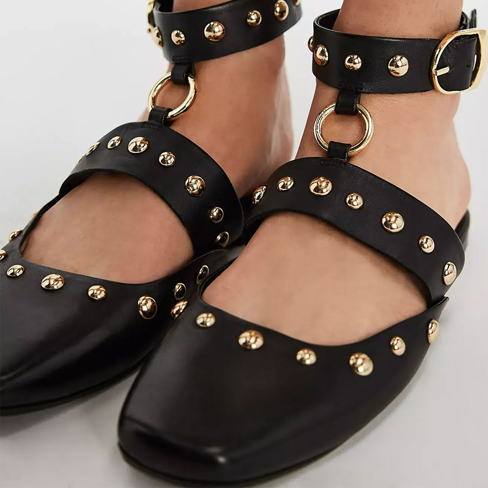 • Special Designs: The square-toe flat shoes feature a studded design, an O-ring design, and an adjustable ankle strap.
