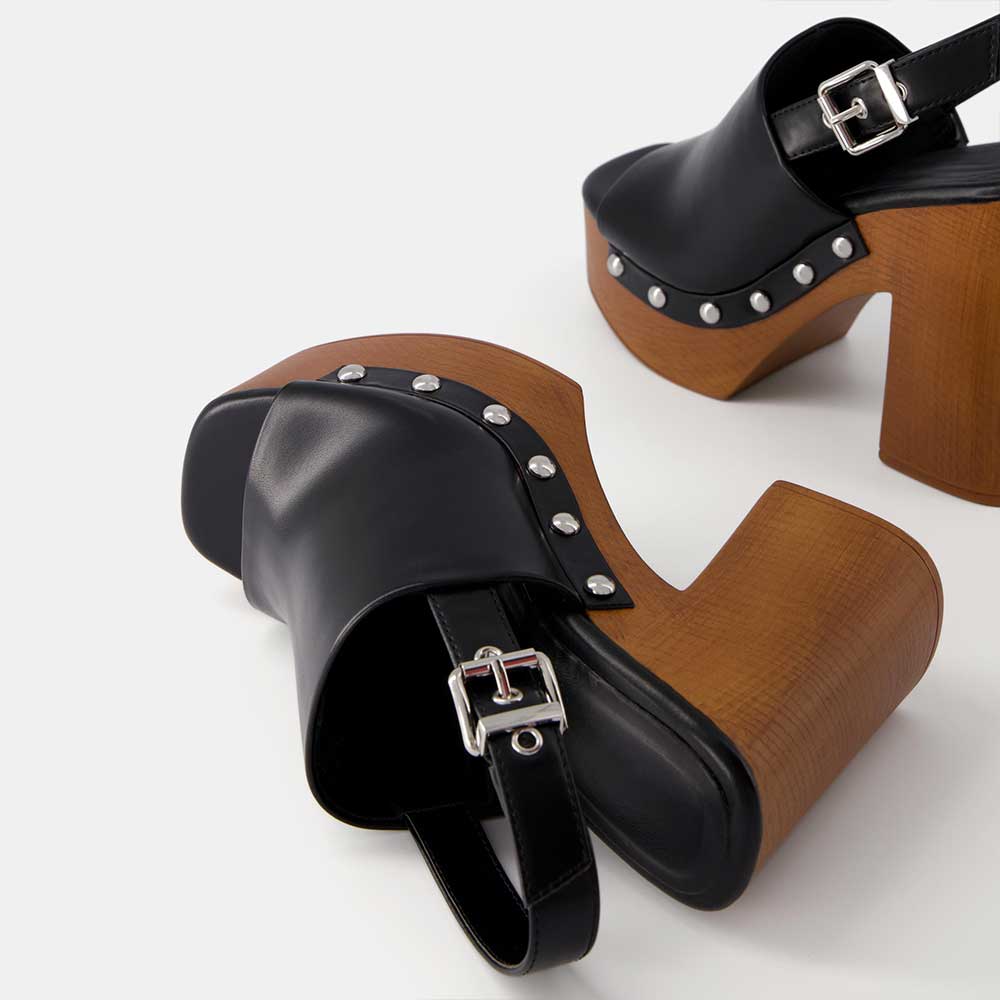 Special Designs: The heeled clogs feature studded design with a buckle slingback.