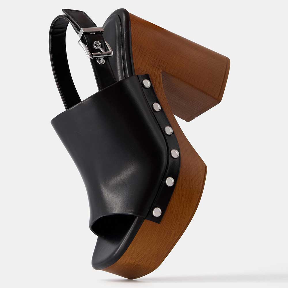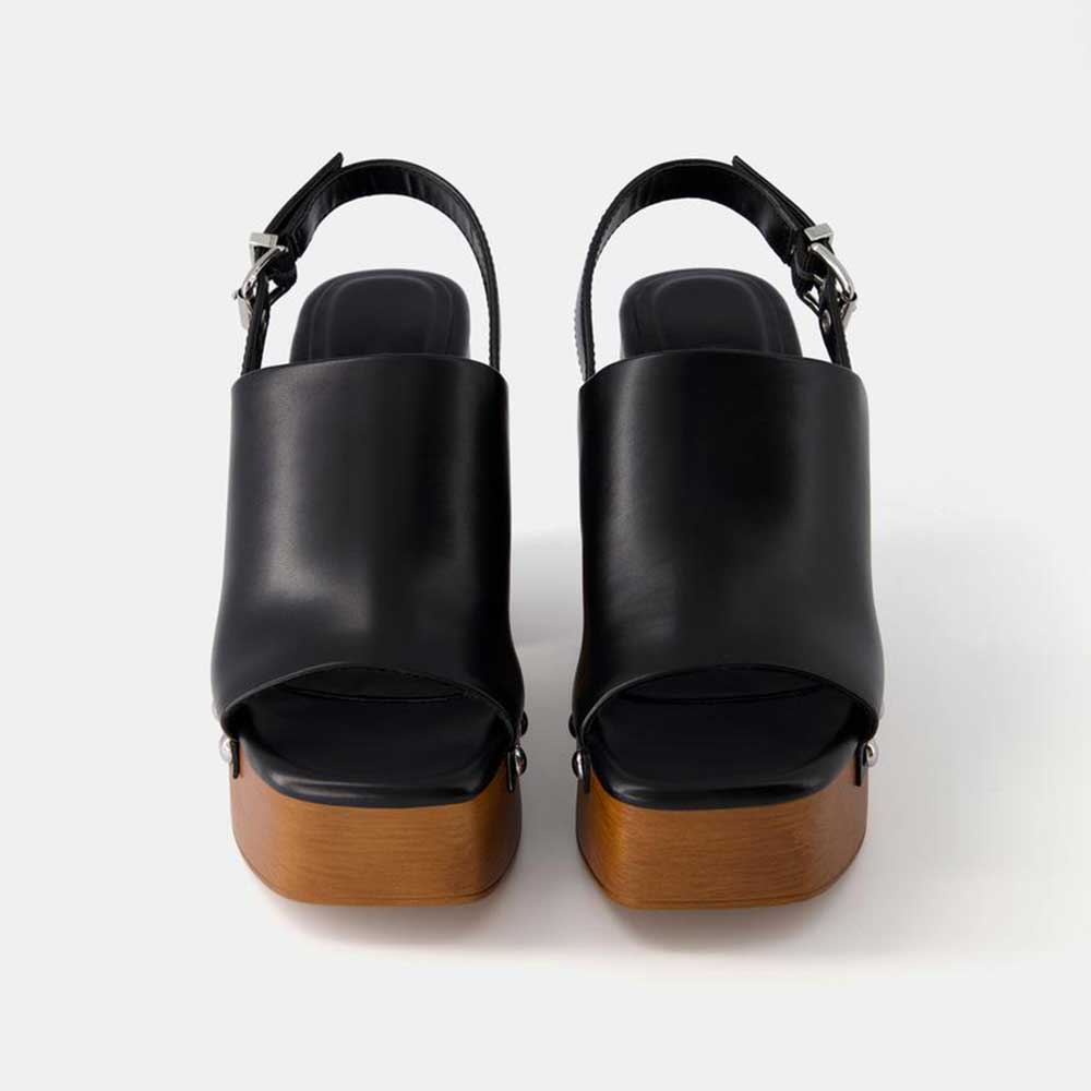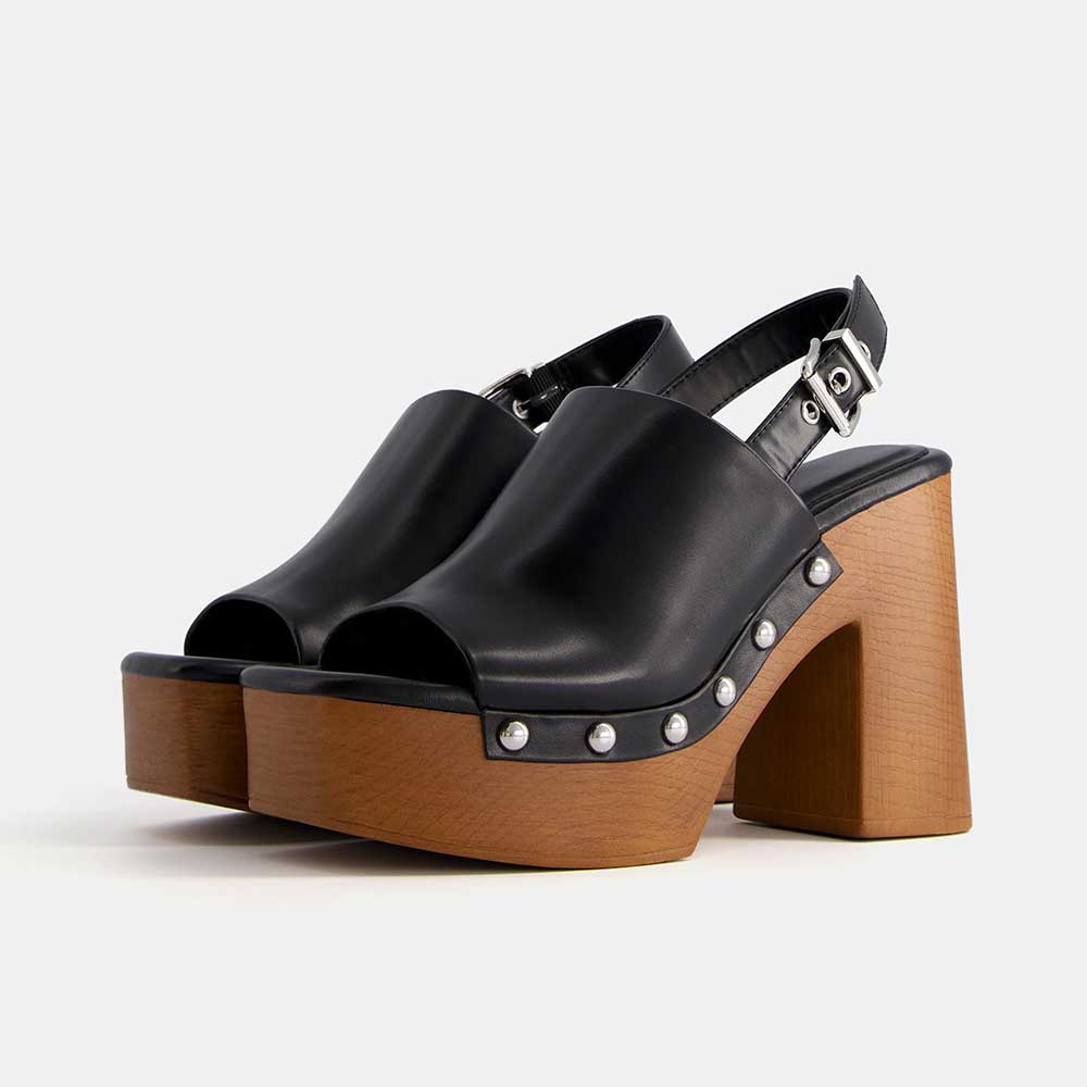 Black Studs Buckle Open Toe Platform Heeled Clogs with Slingback