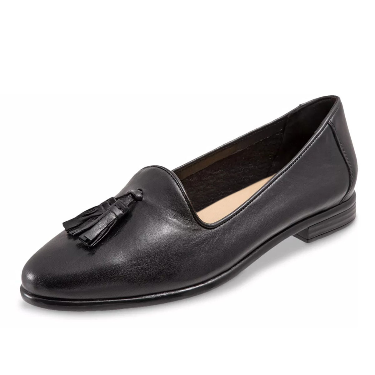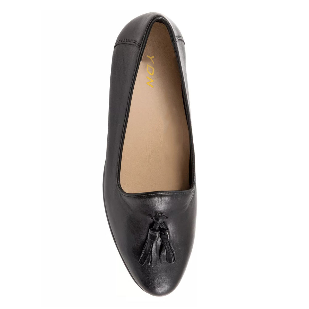 Special Designs: The black flat shoes feature chic tassel accents and almond toes.