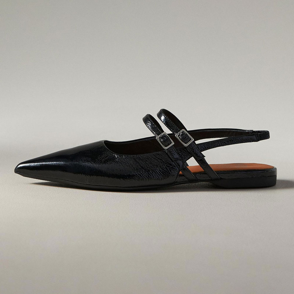 Black Vegan Leather Buckle Strap Slingback Pointed Toe Flats
