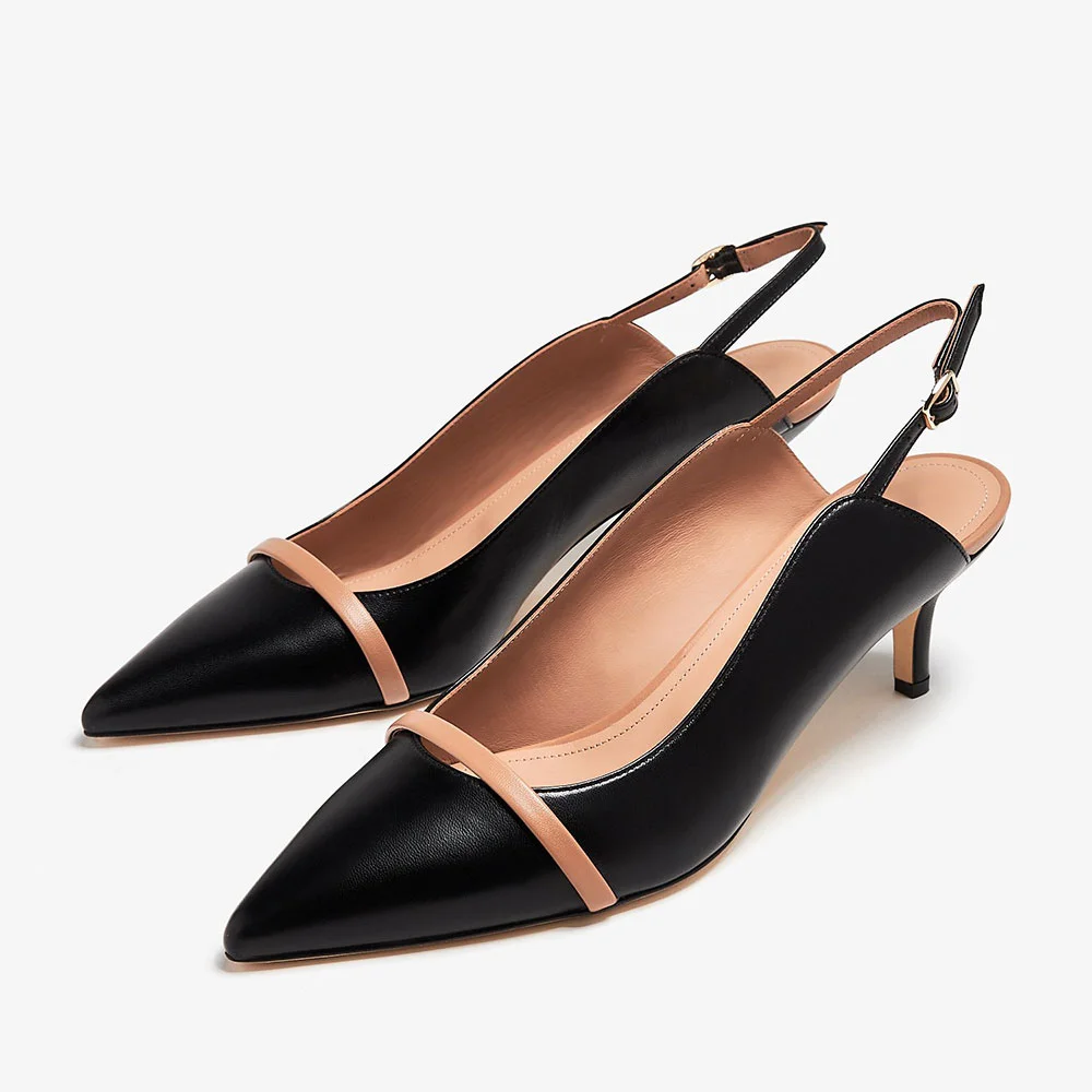 Black Vegan Leather Kitten Heel Slingback Pumps with Pointed Toe