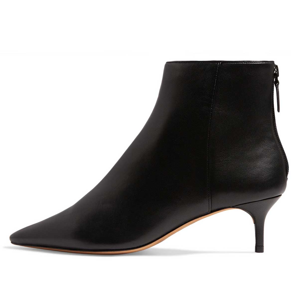 Black Vegan Leather Pointed Toe Back-Zip Ankle Boots with Kitten Heel
