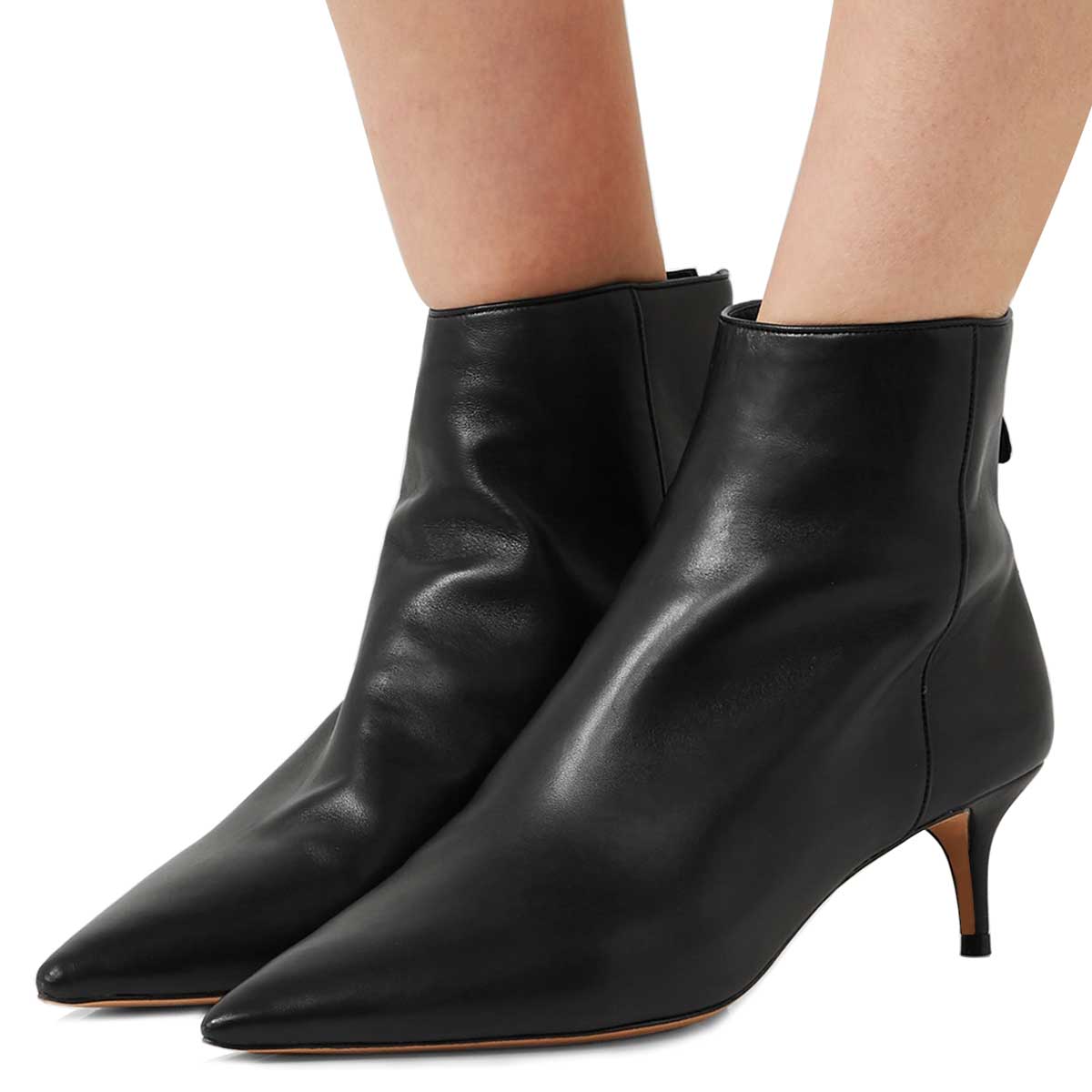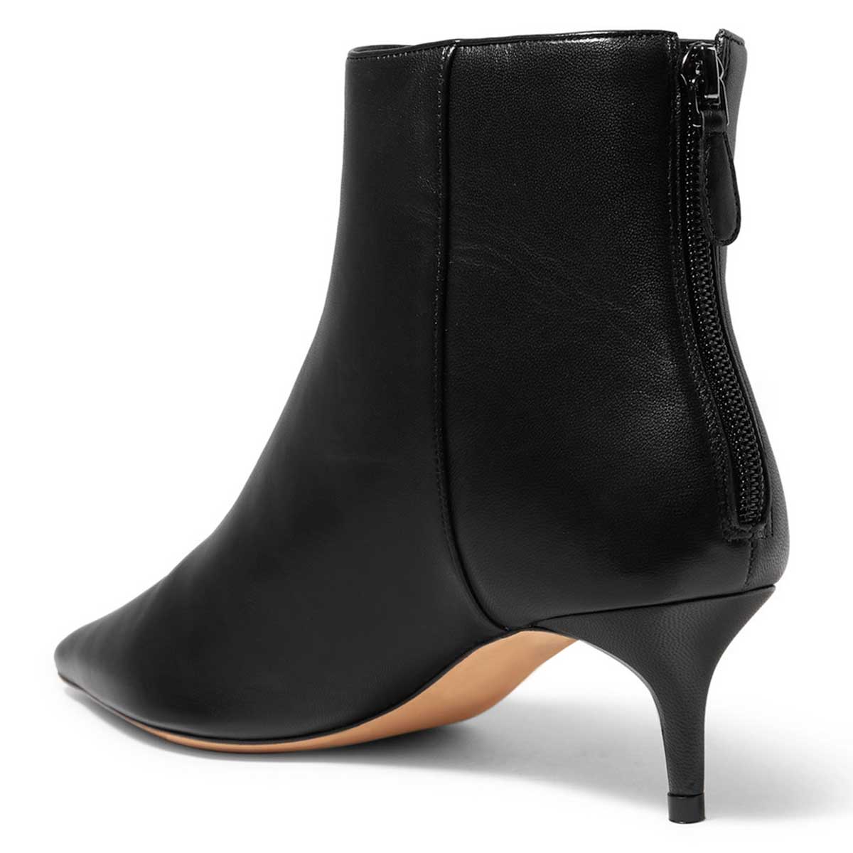 Special Designs: Black classy ankle boots featuring a classic kitten heel and a back-zip closure.