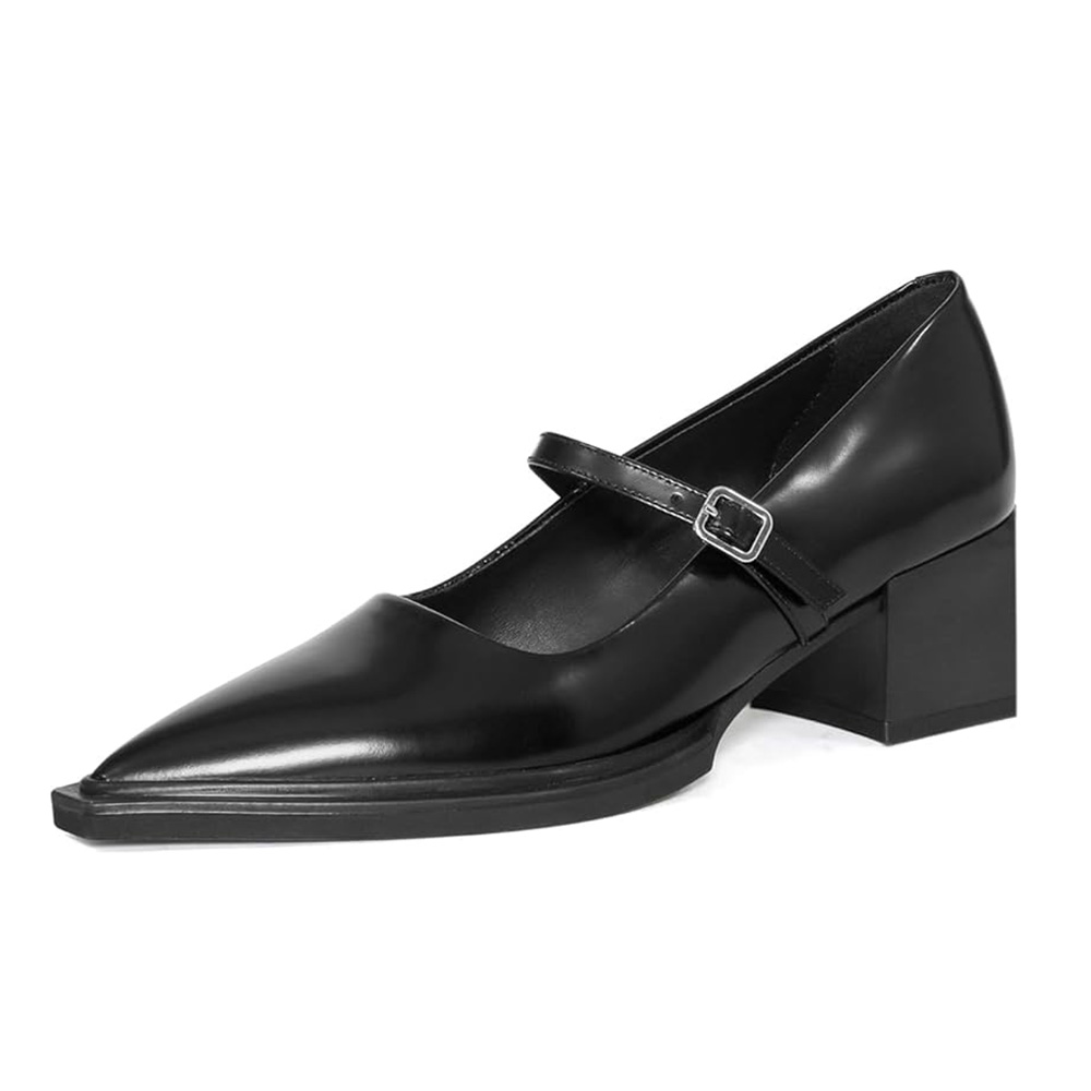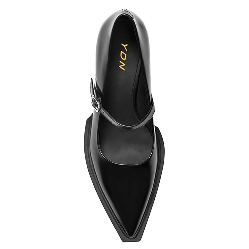 Black Vegan Leather Pointed Toe Buckle Strap Casual Mary Janes