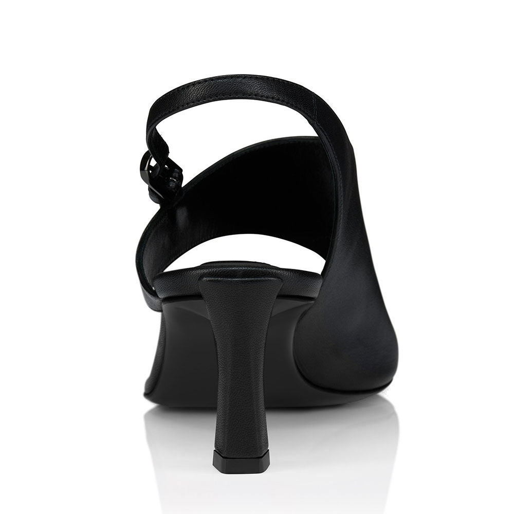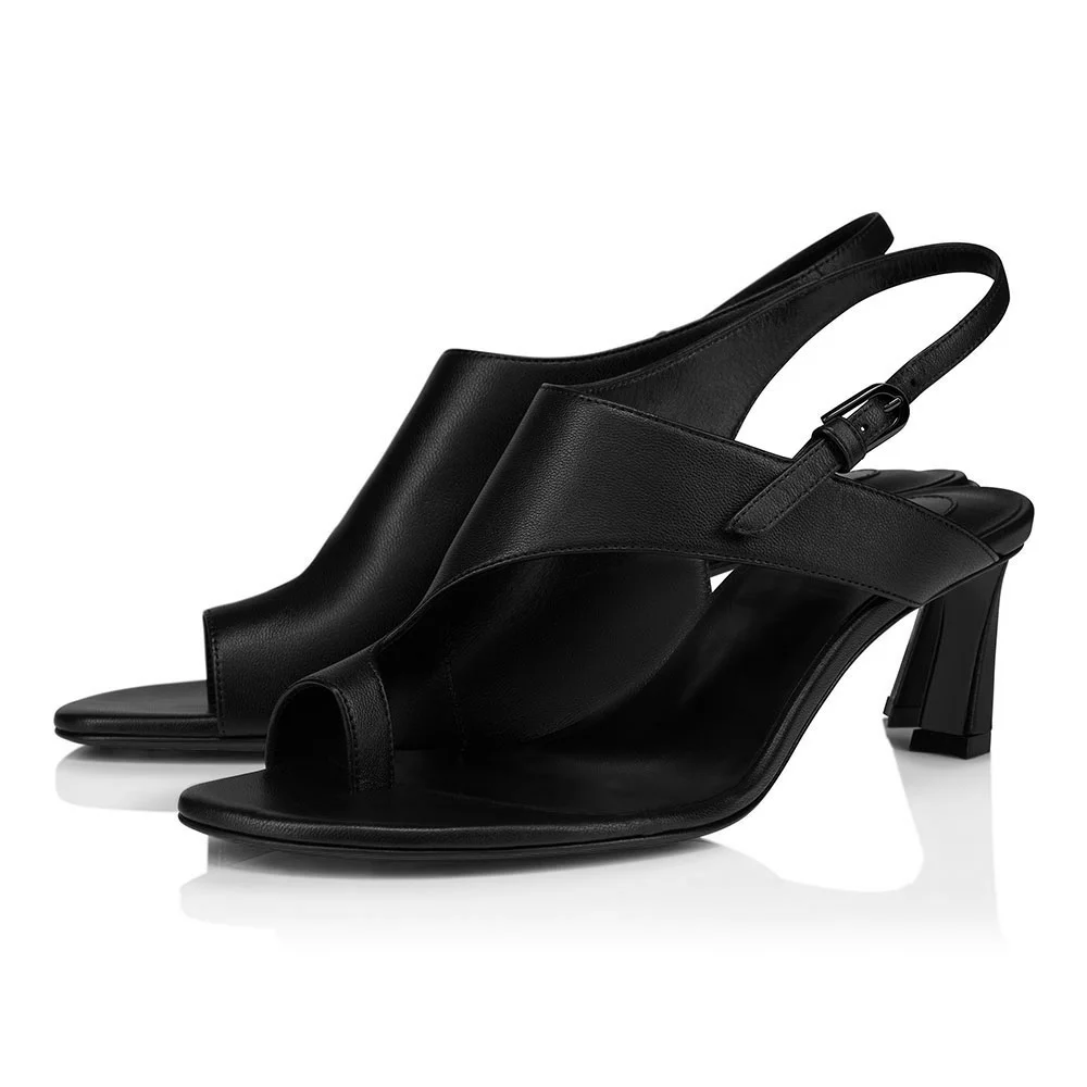 Black Vegan Leather Sculptural Heel Slingback Buckle Toe Loop Sandals