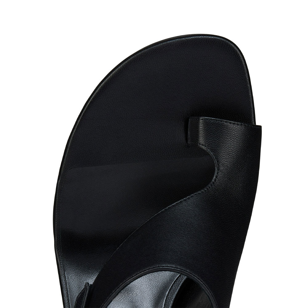 • Special Designs: The black toe loop sandals feature a sculptural heel, a slingback, and a rectangular buckle on the side.
