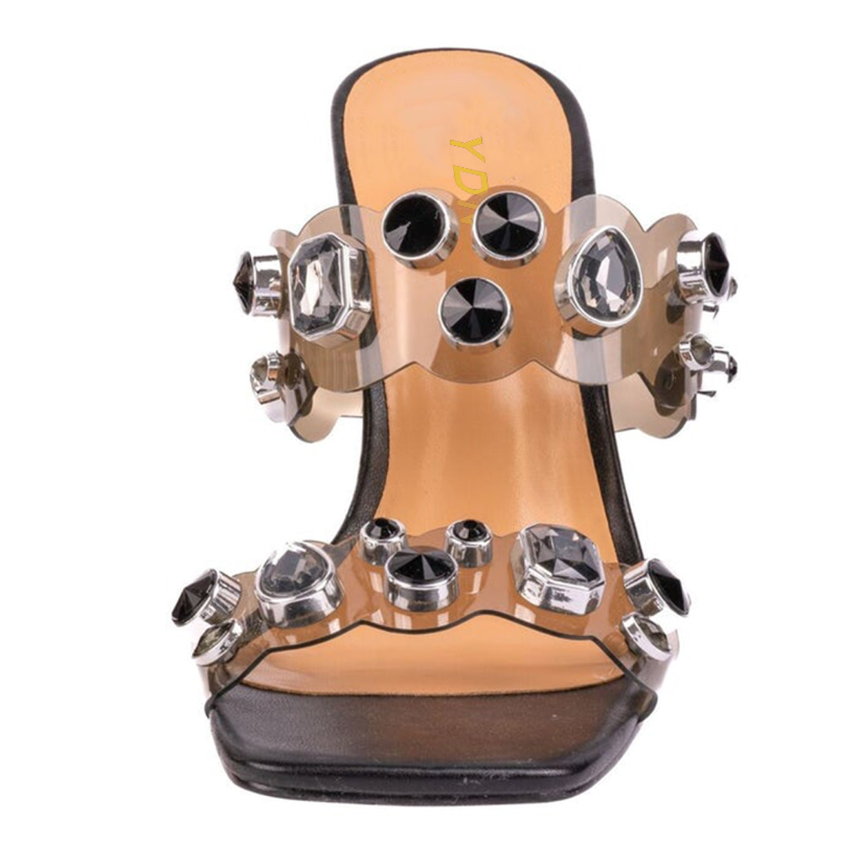 Special Designs: Black mules feature rhinestone embellished clear bands and a colorful high heel.