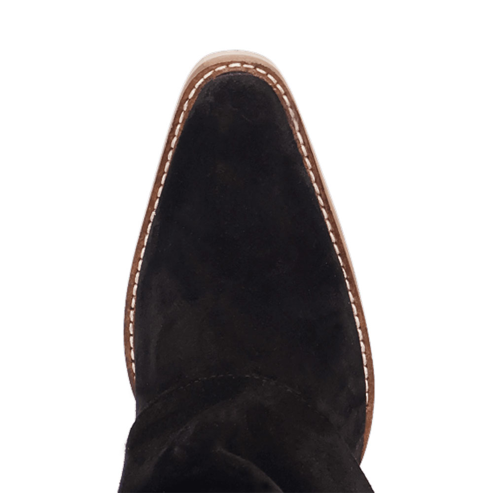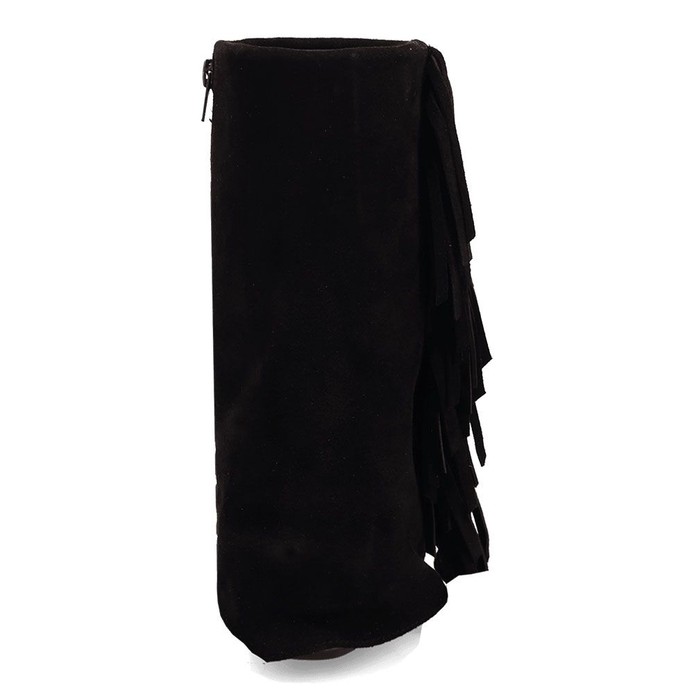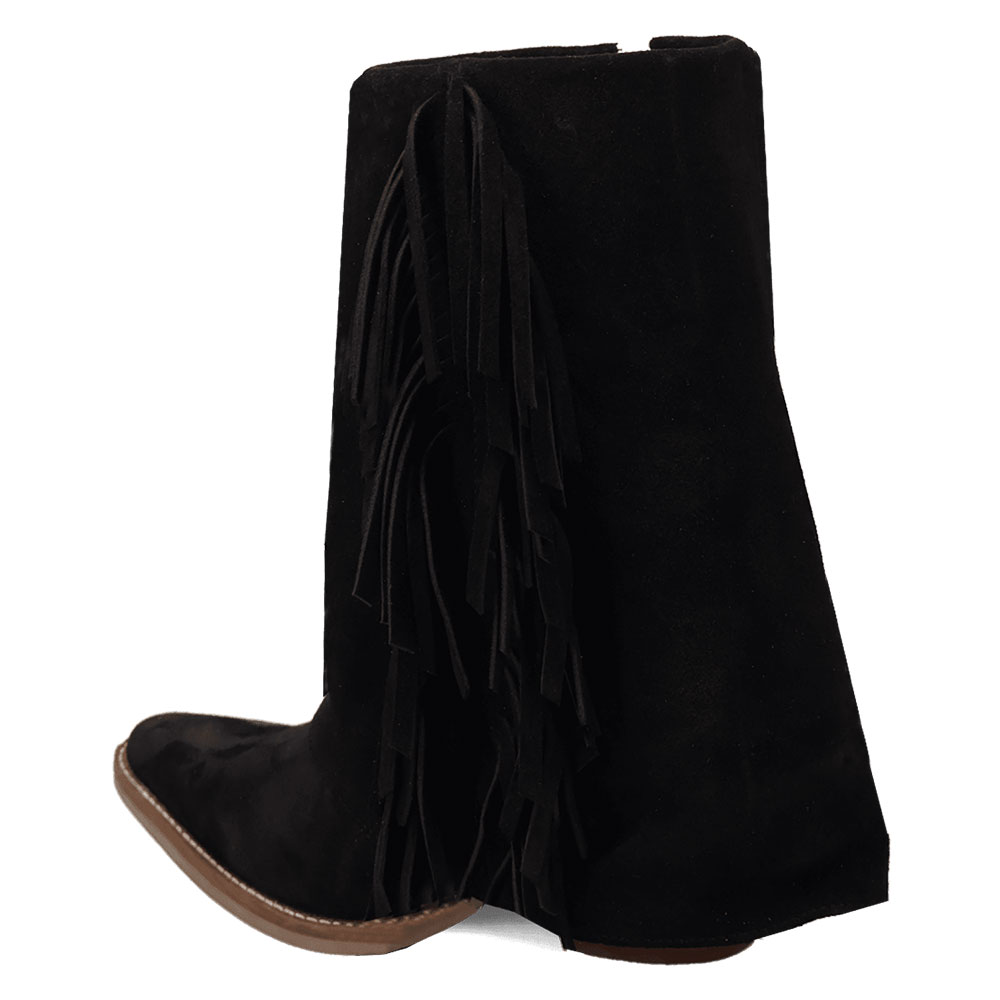 Black Vegan Suede Almond Toe Chunky Heel Fringe Fold Over Boots