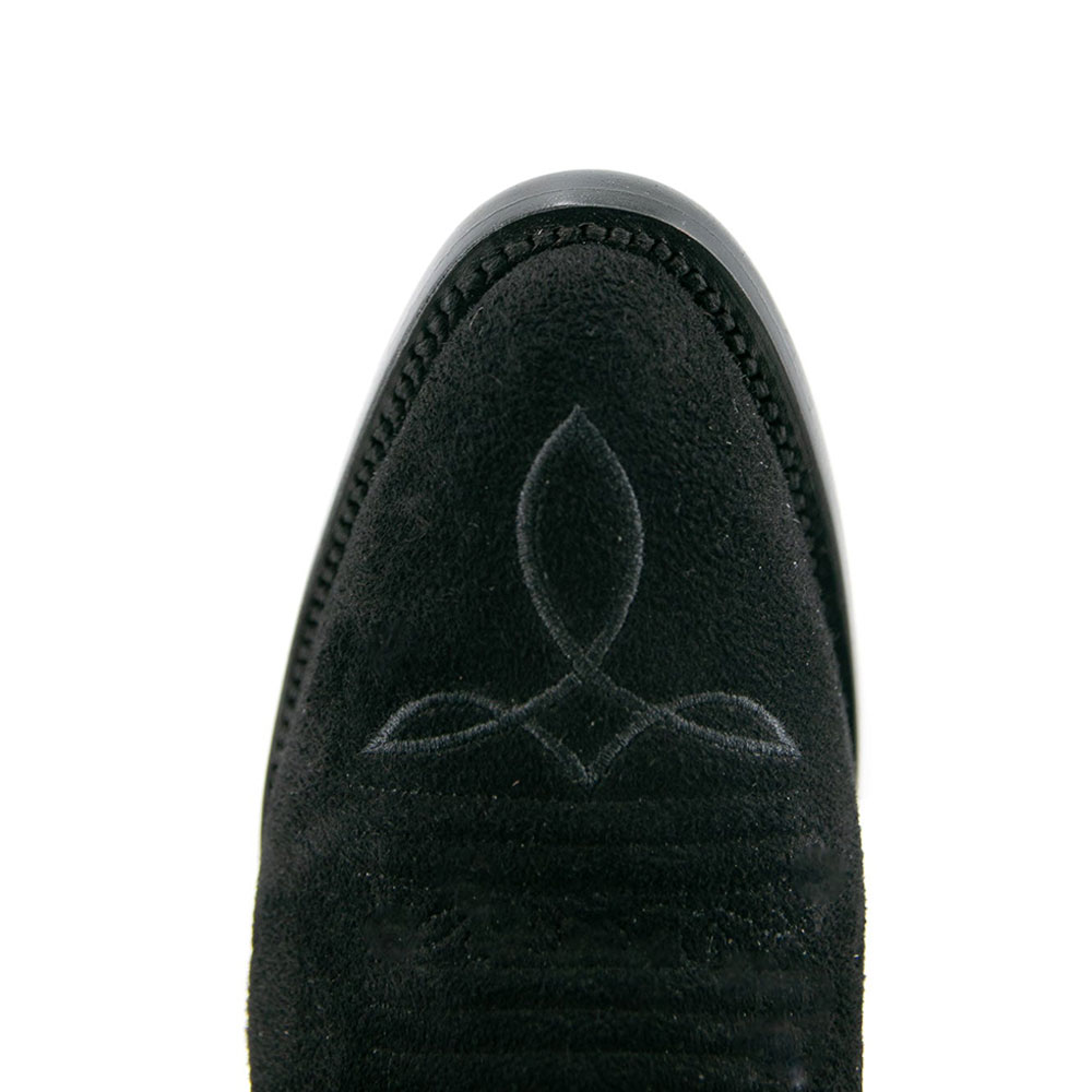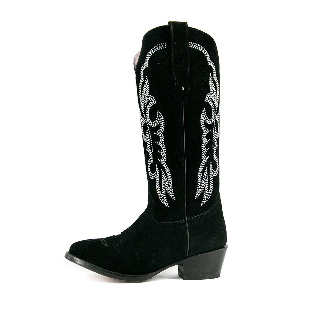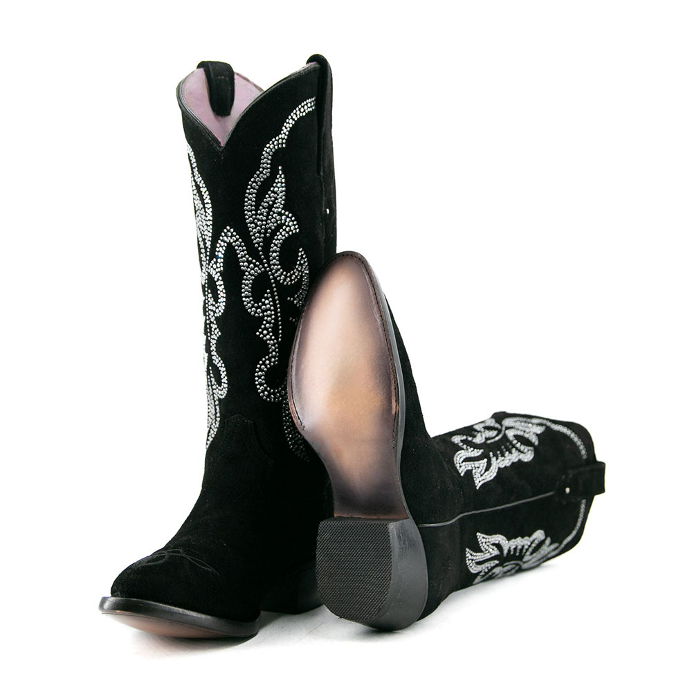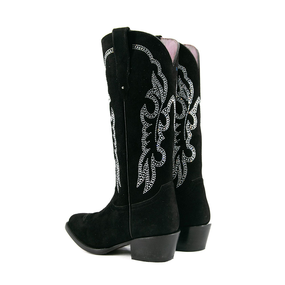 Black Vegan Suede Almond Toe Chunky Heel Rhinestone Tall Cowgirl Boots