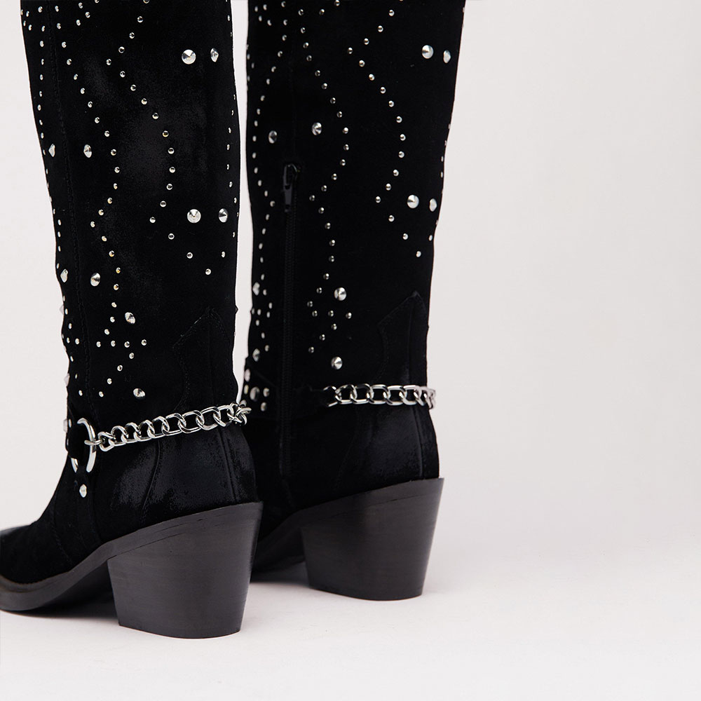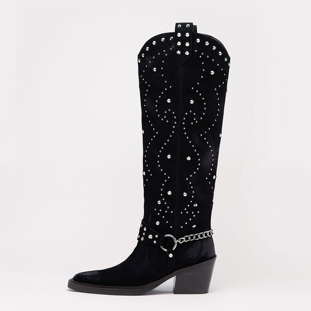 • Special Designs: The black Knee-high western boots feature studs and chains embellishment design, with a comfortable chunky heel.