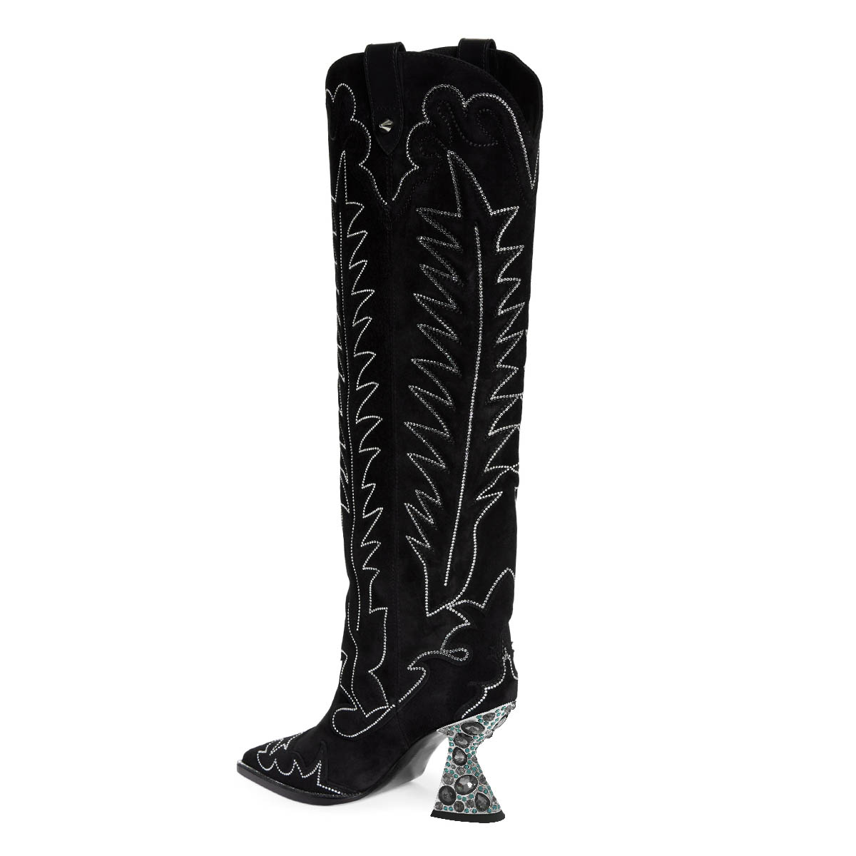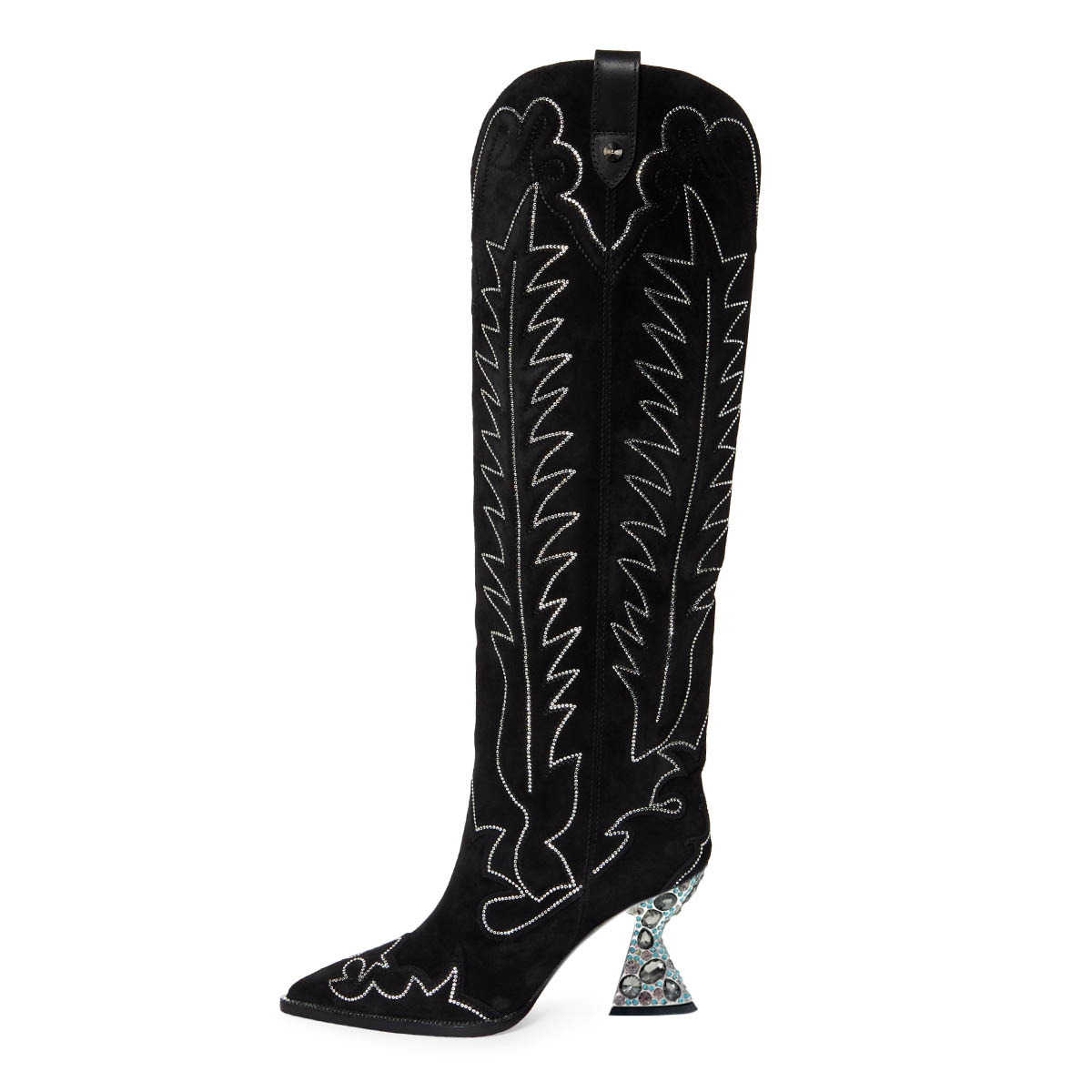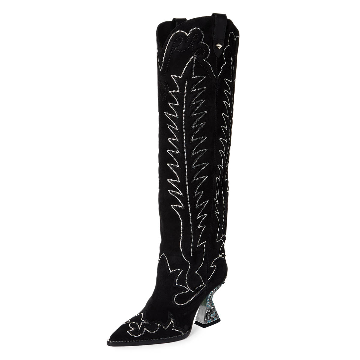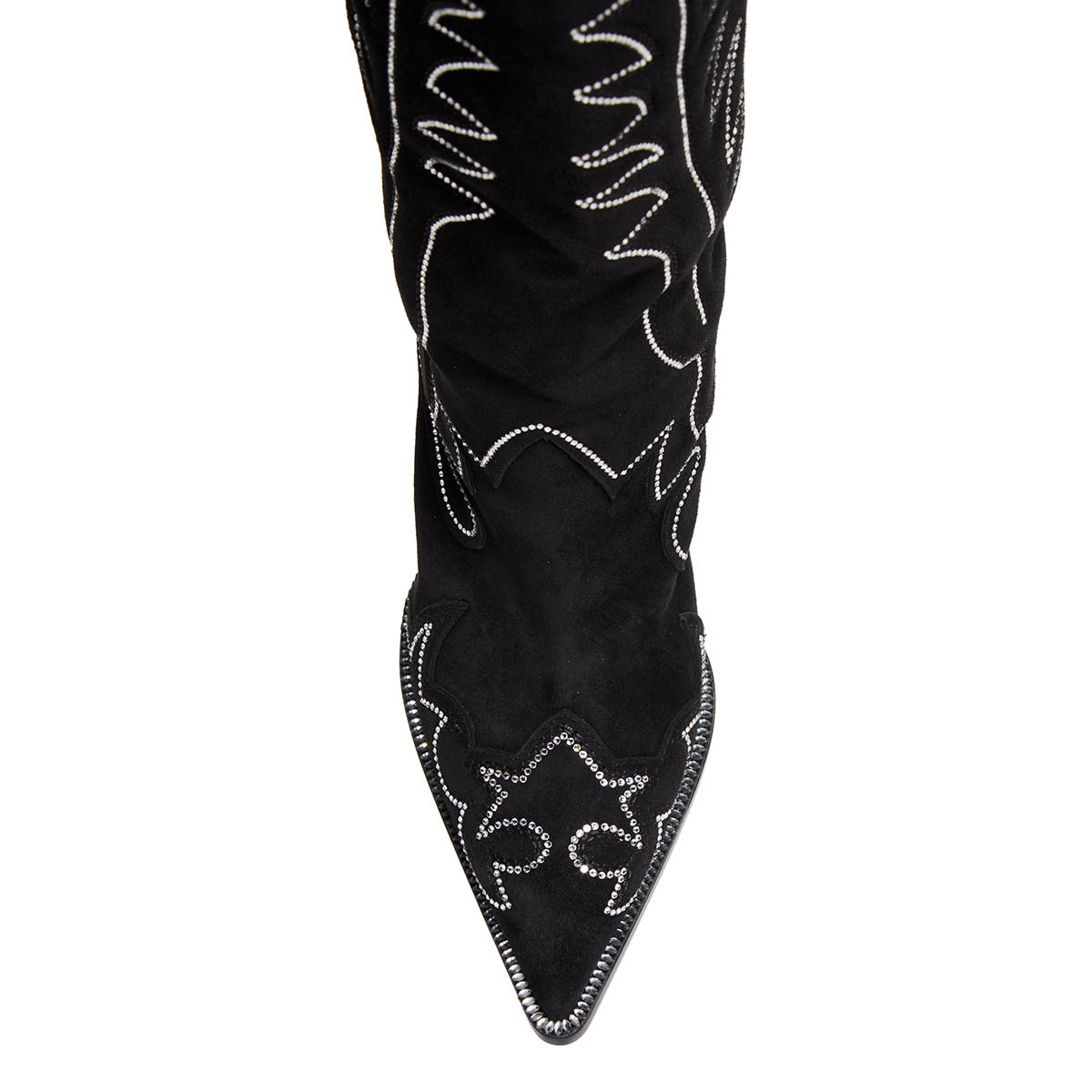 Black Vegan Suede Decorative Heel Rhinestone Studded Cowgirl Boots