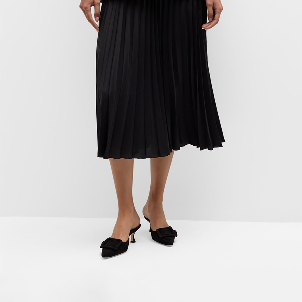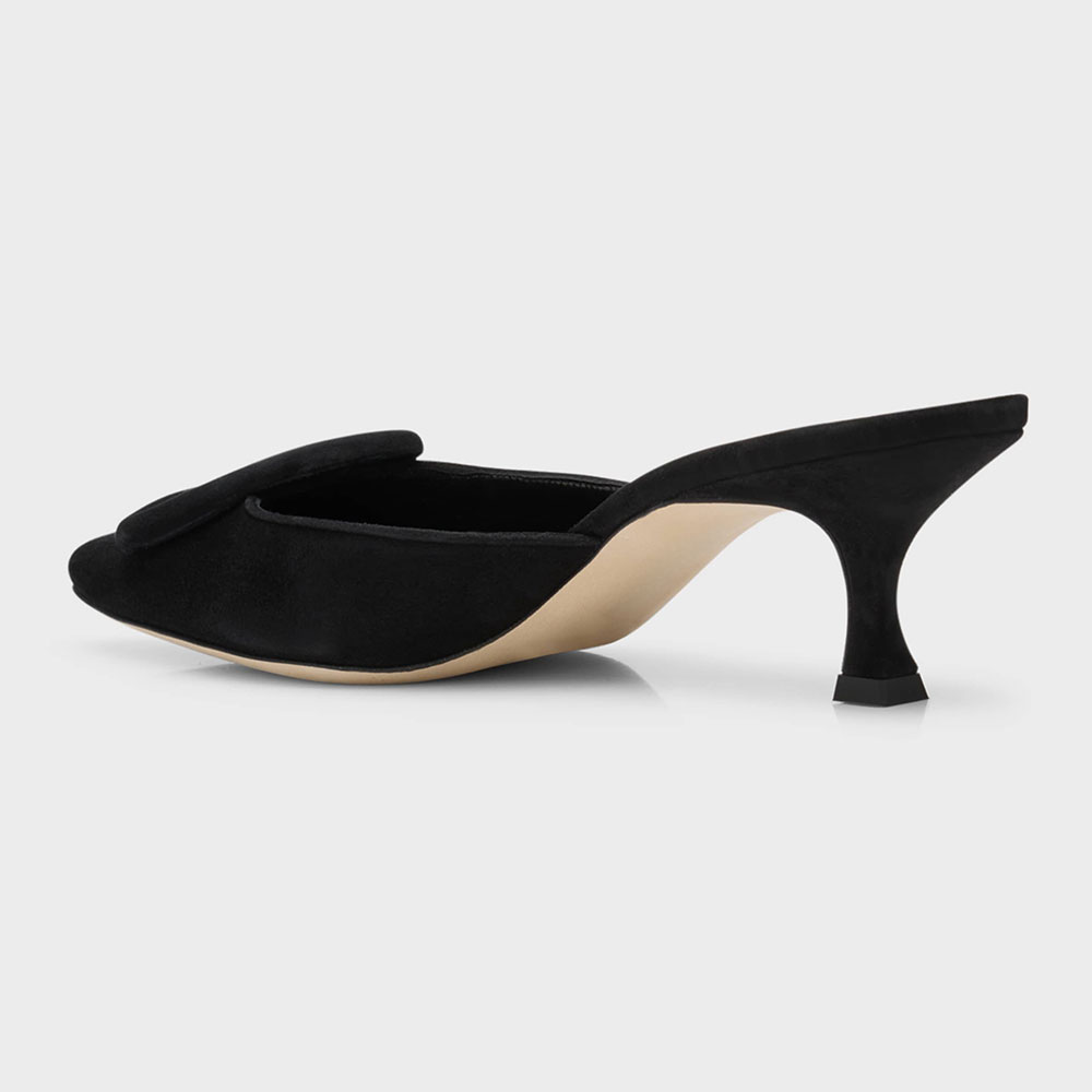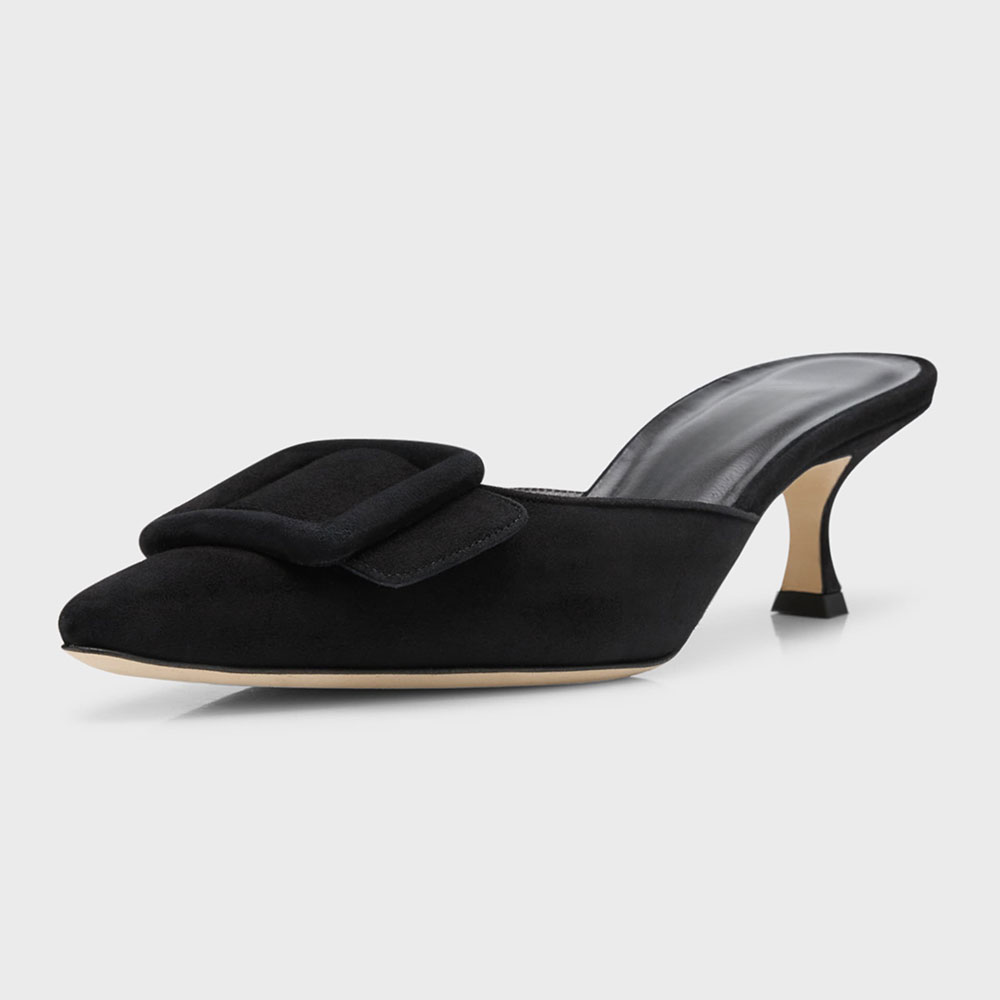 Black Vegan Suede Kitten Heel Slip On Pointy Toe Mules with Buckle