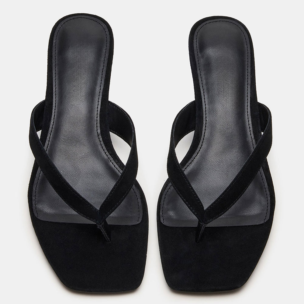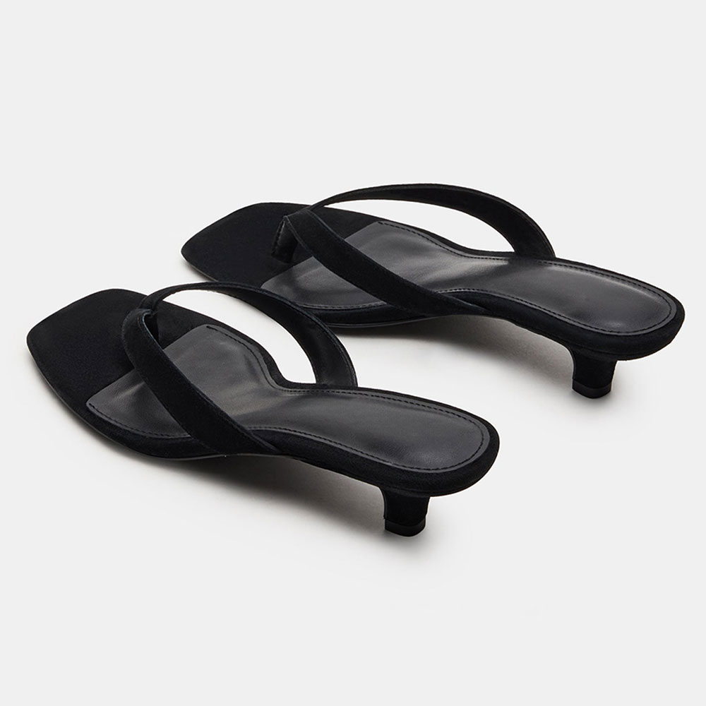 Black Vegan Suede Open Square Toe Kitten Heel Flip Flops for Women
