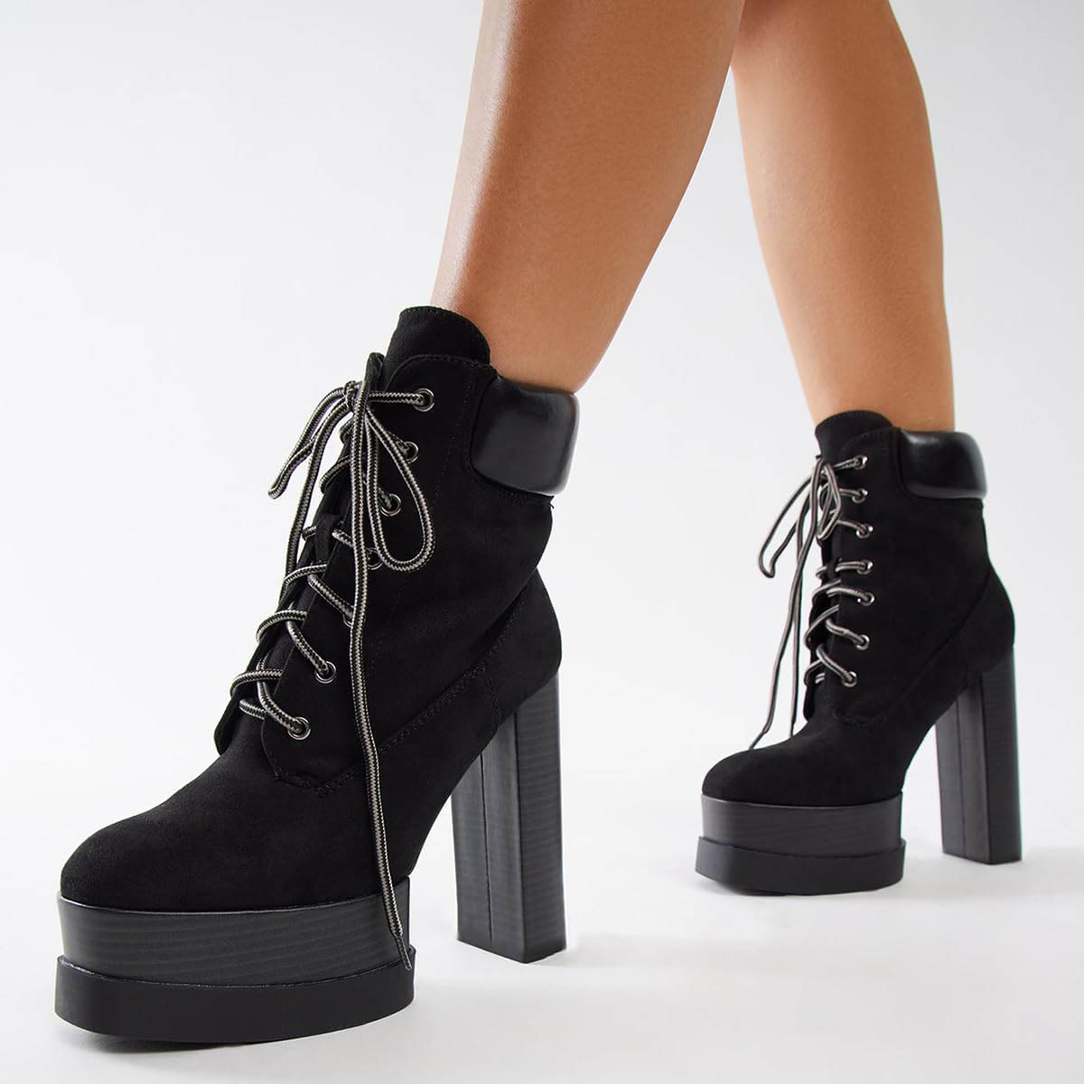 • Special Designs: The round-toe platform lace-up booties feature block high heels.