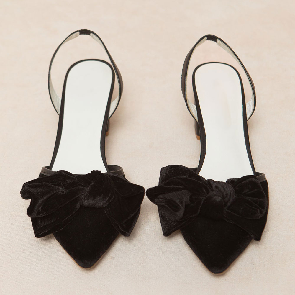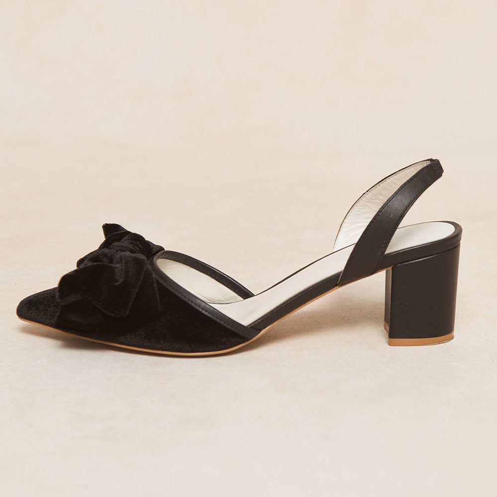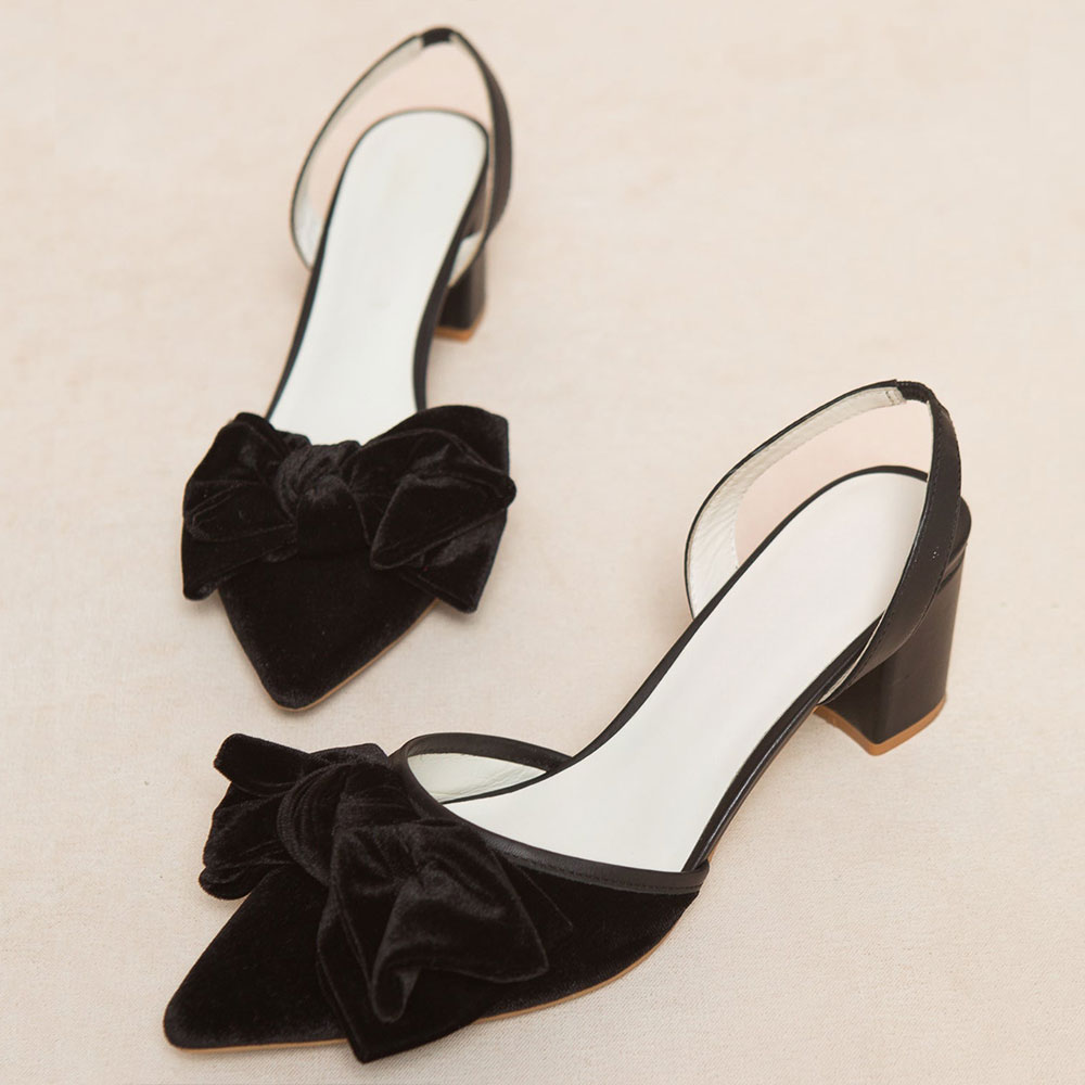 Black Velvet Pointed Toe Bow Decor Block Heel Slingback Pumps