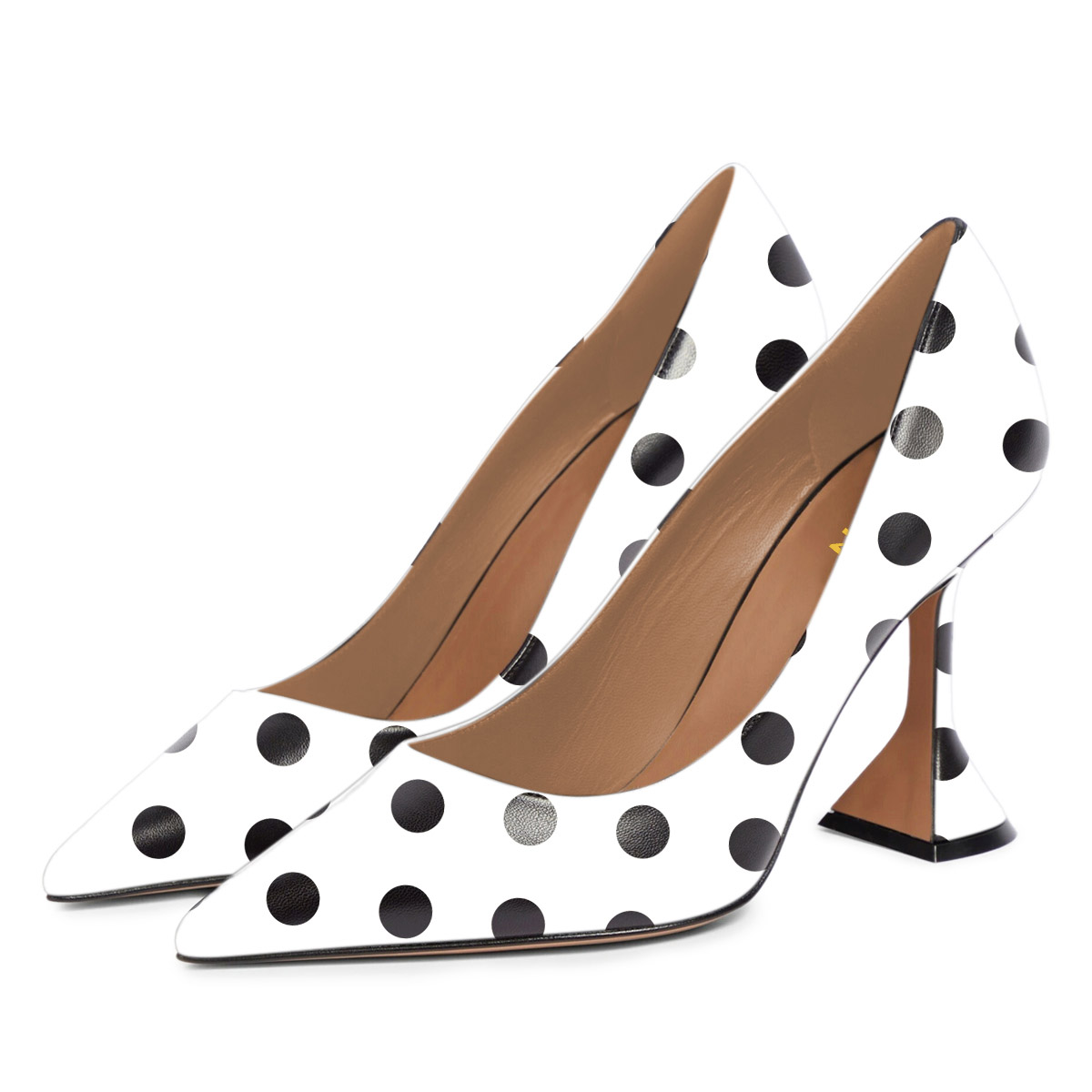 • Special Designs: Black and white polka dot pumps feature a stylish pointed-toe and flared heel design