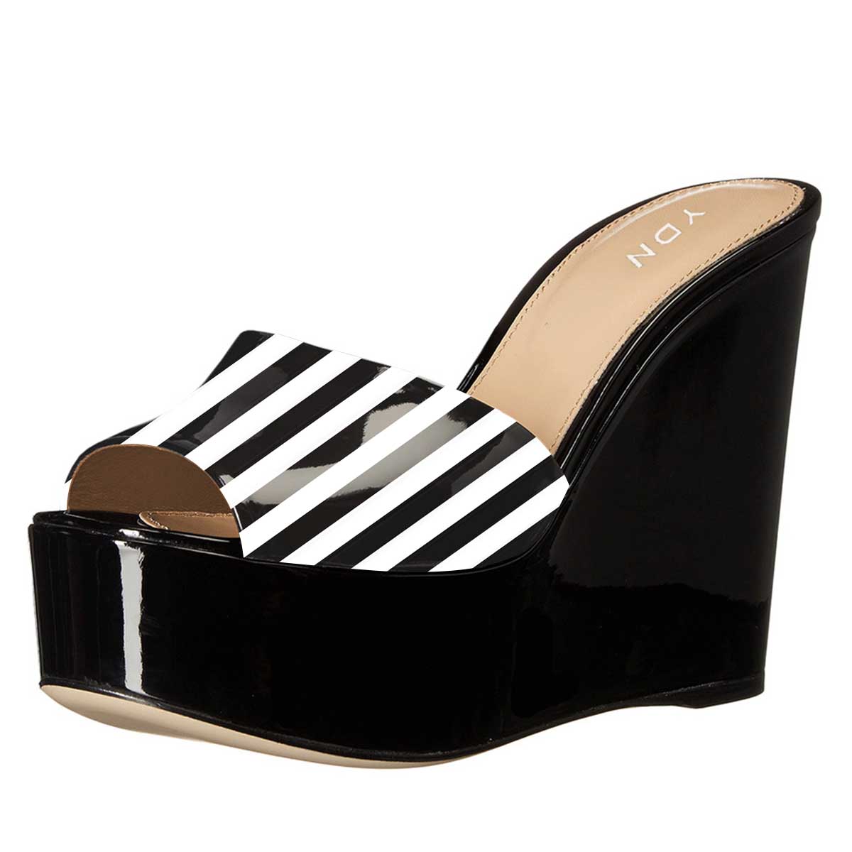 Black & White Stripe Platform Mules Peep Toe Slip on Wedge Sandals