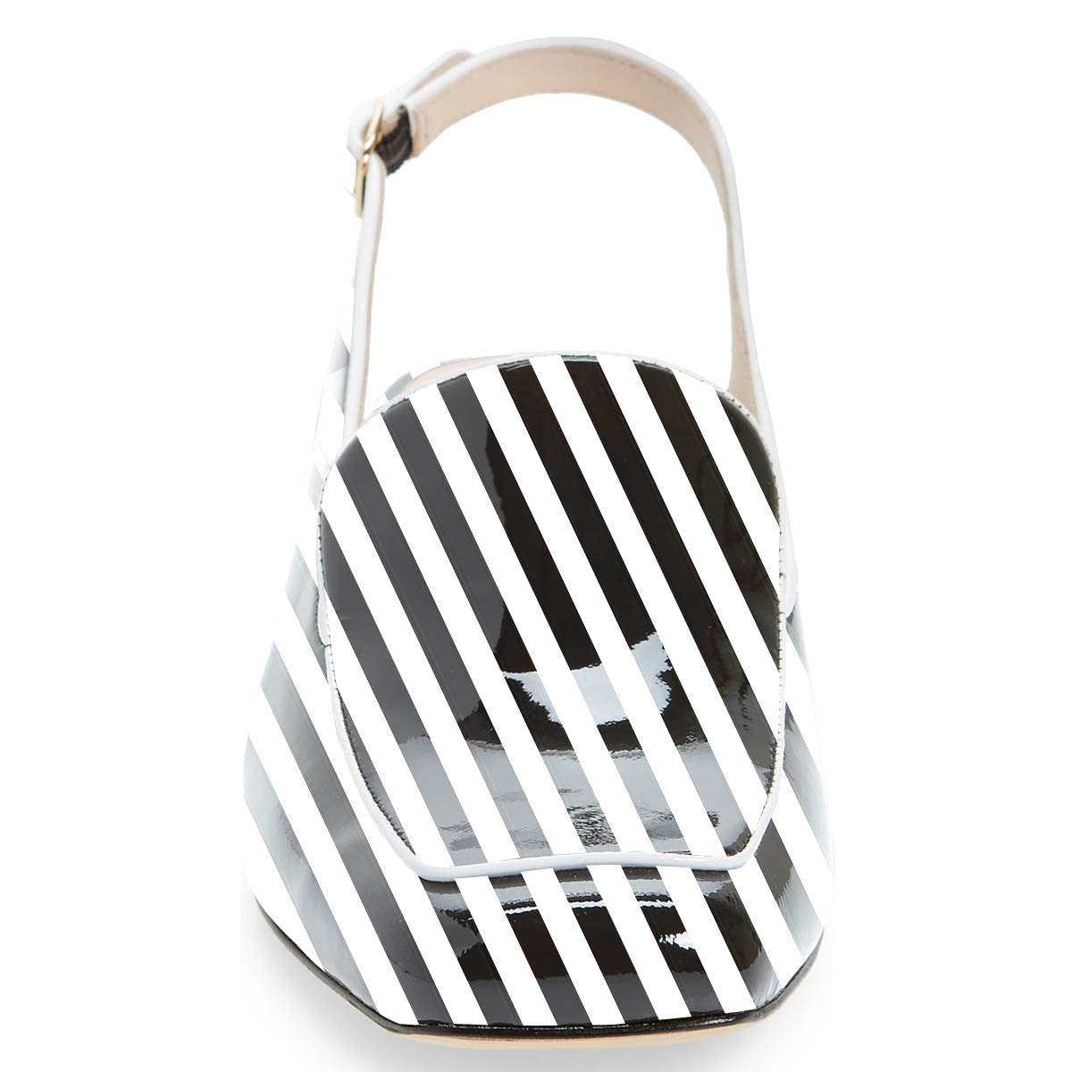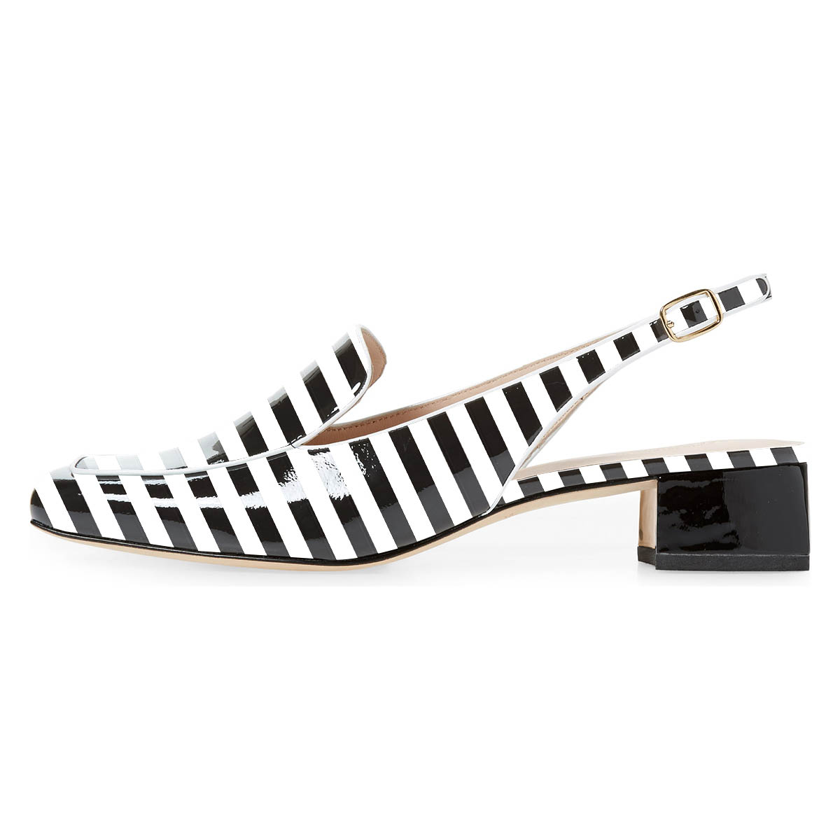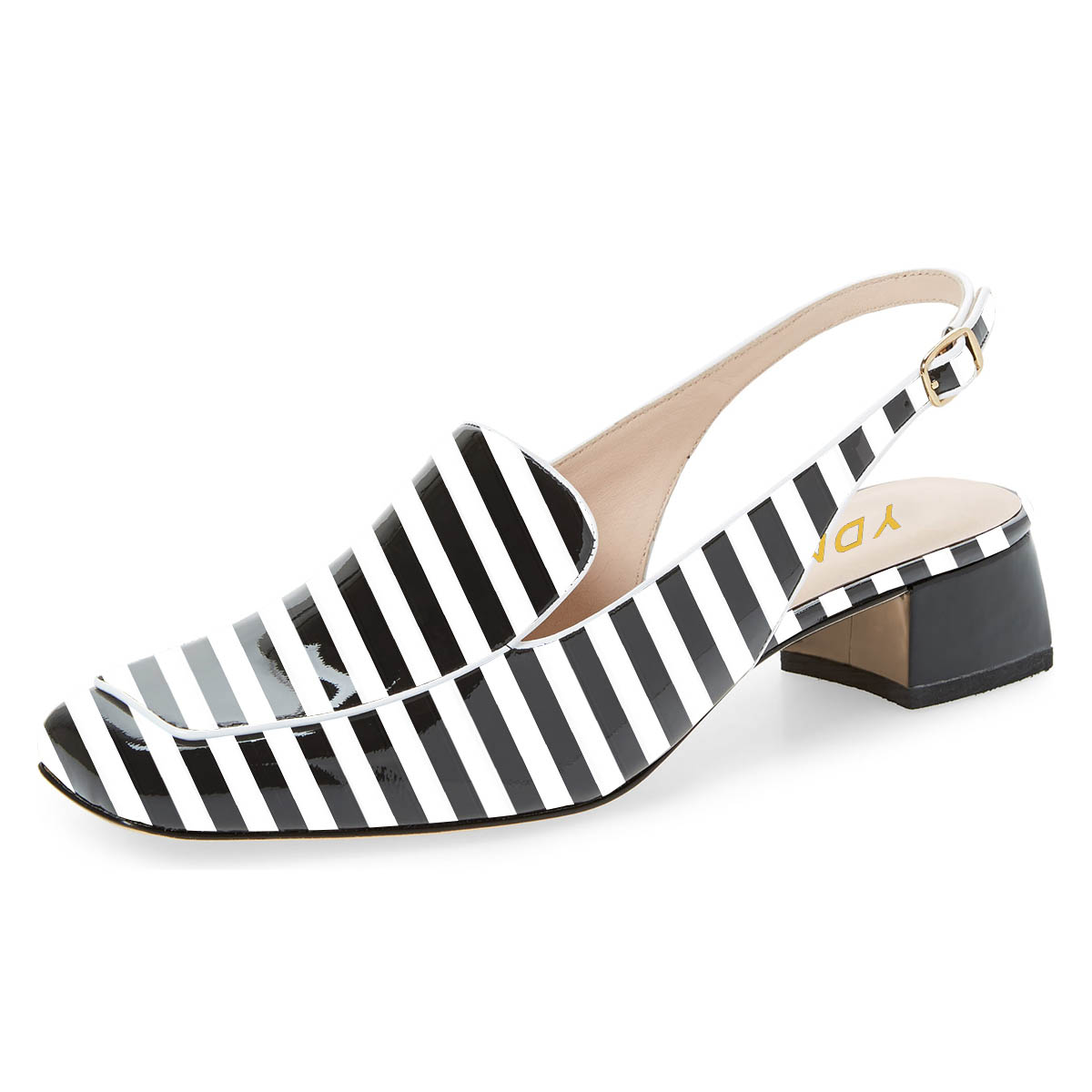 Special Designs: The square-toe slingback loafer shoes feature chunky low heels and a black and white stripe design.