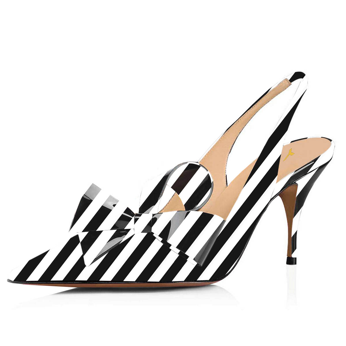 • Special Designs: The patent leather pointed-toe slingback pumps feature a bow embellishment and black & white stripes.