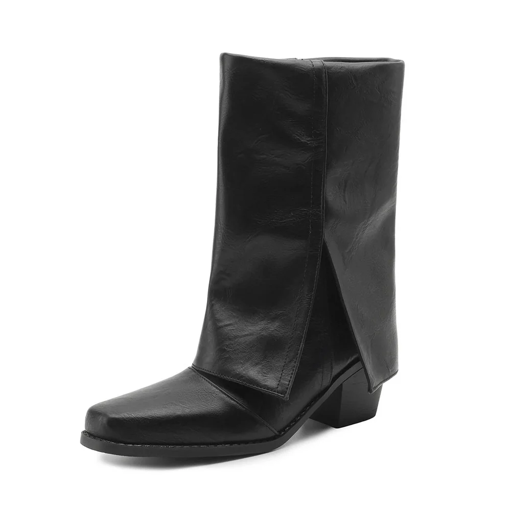 Block Heel Snip Toe Mid Calf Black Western Slip On Fold Over Boots